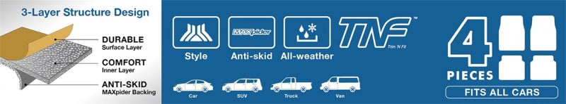 Unlike the traditional floor mats with heavy weights, commercial rubbery looking; 3D MAXpider custom-fit floor mats are the revolutionary interior protection for your vehicles with an innovative, unique three-layer structure. The digitized three dimensional design measured to exact cabin contours of your vehicle for trapping mess and spills yet, patented anti-skid backing keeps mats in place without harming the original carpet. Choices of stylish carbon fiber texture rubber surface or classic looped fabric surface.