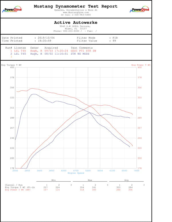 The dyno chart shows an increase of 18 whp using the Active catted downpipe and signature exhaust with the stock tune (just FYI our stage 1 and stage 2 tunes are showing whp increases of 53 and 94 using the catted down pipe and signature exhaust).