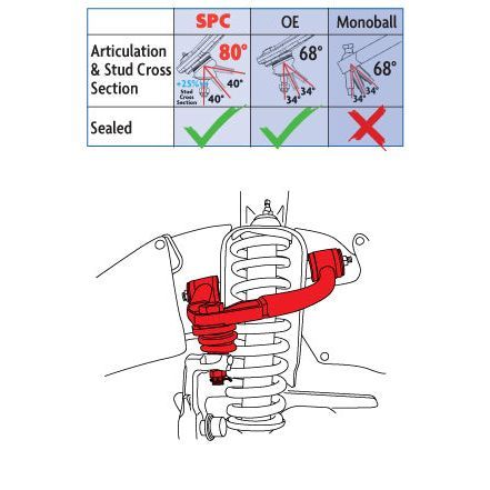 Get more droop travel: SPC's arm has improved clearance to get around the spring bucket when the arm droops, eliminating arm to frame contact on lifted trucks. The maintainable ball joint has an oversized ball and allows more than 80° of articulation to ensure it never binds. SpecRide bushings have free pivot to eliminate any chance of bushing failure seen on many high travel suspensions.