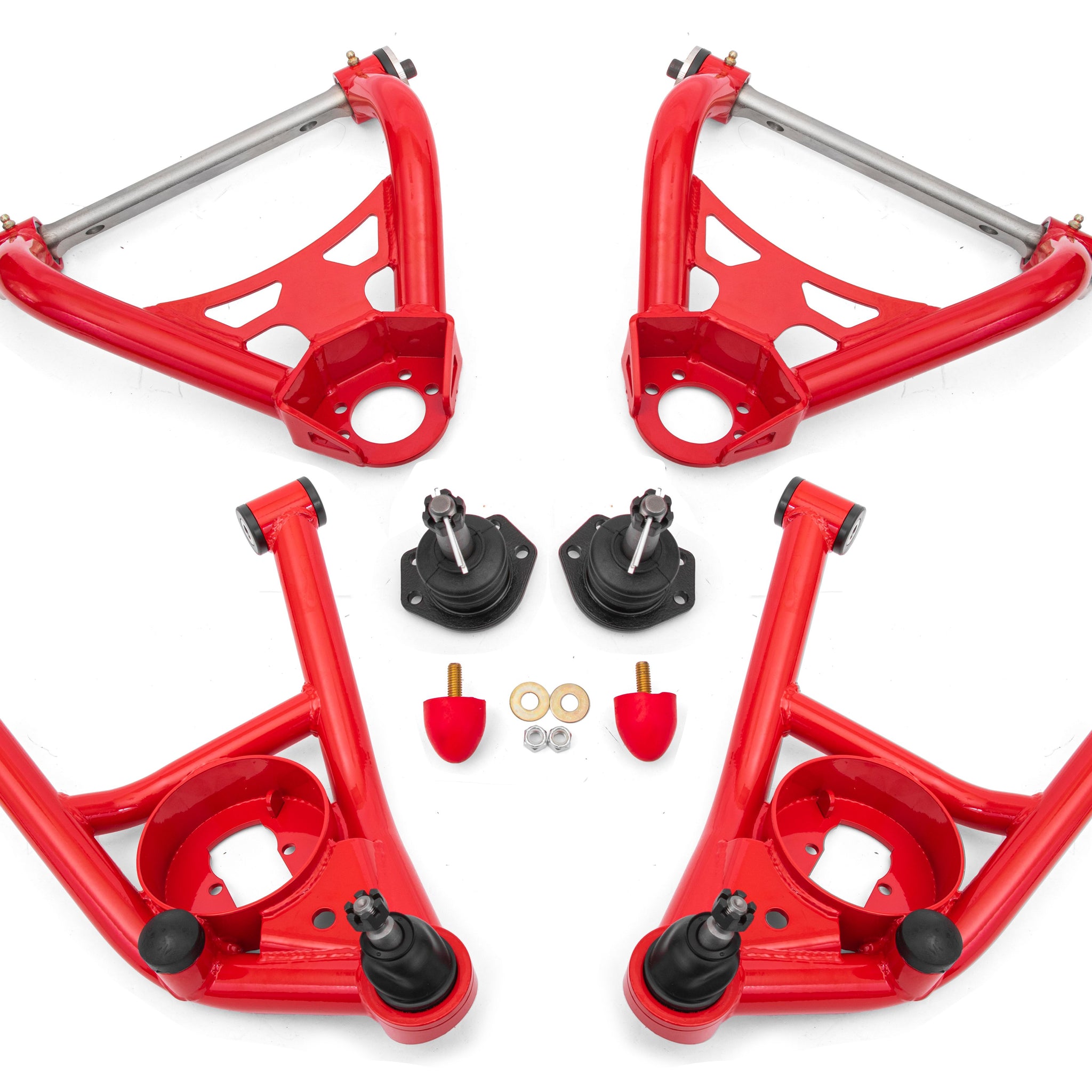 | Description_ASC | Fits 1964-1972 GM A-Body;Eliminates upper and lower A-arm deflection;Improves steering feel and response for normal and performance driving;Increased high-speed stability;Laser-cut, CNC-formed plate steel braces for extra strength;Fixture welded for precise fit;Dual-offset cross-shafts for minimizing shim stack;Requires less shim stack for negative camber than OE arms;Internally fluted, Delrin bushings;Two additional degrees of positive caster built into A-arms;Additional headers clearance;Pre-assembled with new polyurethane bumpstops;Includes new upper and lower ball joints;Durable powdercoat finish;Proudly made in the U.S.A. |
