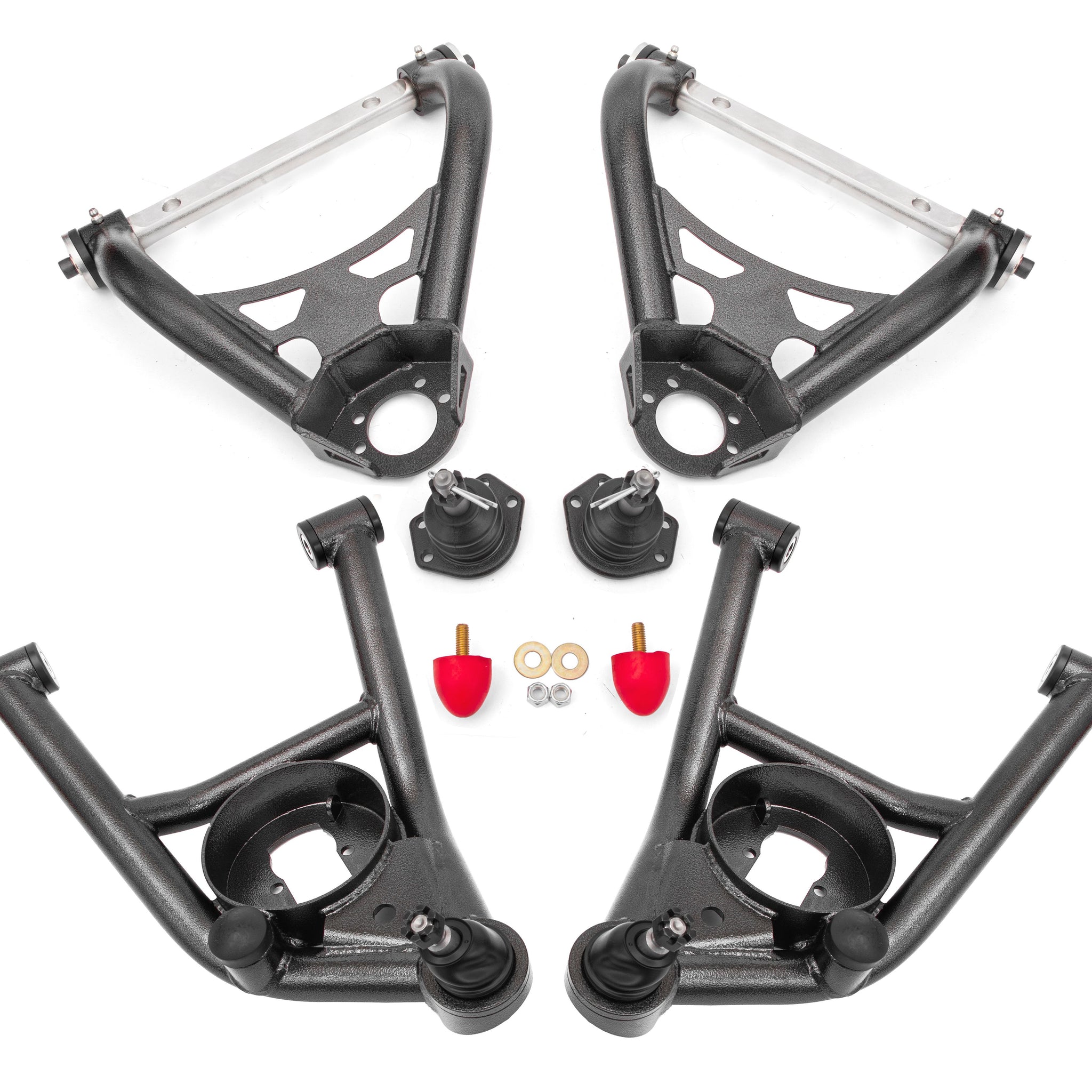Description_ASC Fits 1964-1972 GM A-Body;Eliminates upper and lower A-arm deflection;Improves steering feel and response for normal and performance driving;Increased high-speed stability;Laser-cut, CNC-formed plate steel braces for extra strength;Fixture welded for precise fit;Dual-offset cross-shafts for minimizing shim stack;Requires less shim stack for negative camber than OE arms;Internally fluted, Delrin bushings;Two additional degrees of positive caster built into A-arms;Additional headers clearance;Pre-assembled with new polyurethane bumpstops;Includes new upper and lower ball joints;Durable powdercoat finish;Proudly made in the U.S.A.
