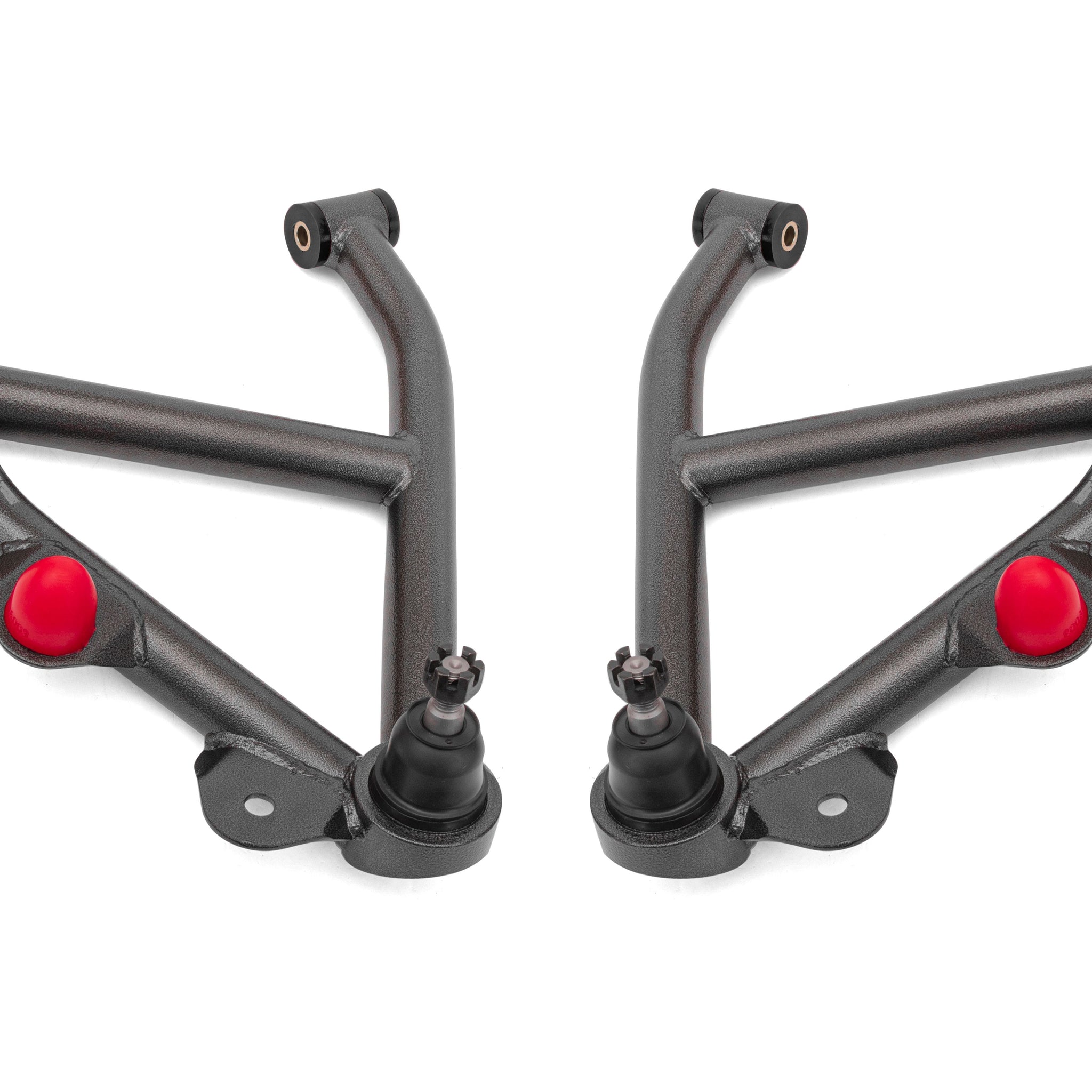 Description_MKT A-arms are one of the most important, yet overlooked suspension components. They are the direct link between the front wheels and the chassis. Any deflection causes a change in alignment, which results in poor performance and driving feel. Fabricated from heavy-duty 1.500-inch, 0.095-inch wall and 1.525-inch, 0.095-inch wall DOM tubing with laser-cut, CNC-formed plate steel braces for extra strength, deflection is eliminated with A-arms from BMR Suspension. BMR?s AAL333 Lower A-arms are fitted with heavy-duty ball joints and greaseable, Delrin bushings add a solid, more responsive feel over the stock rubber bushings. BMR?s bushings are internally fluted, which allows grease to evenly coat the inner sleeve. These flutes also direct grease to the outer edge of the bushing, keeping the thrust surface lubricated. This efficient lubrication ensures reliable operation over the life of the bushings.