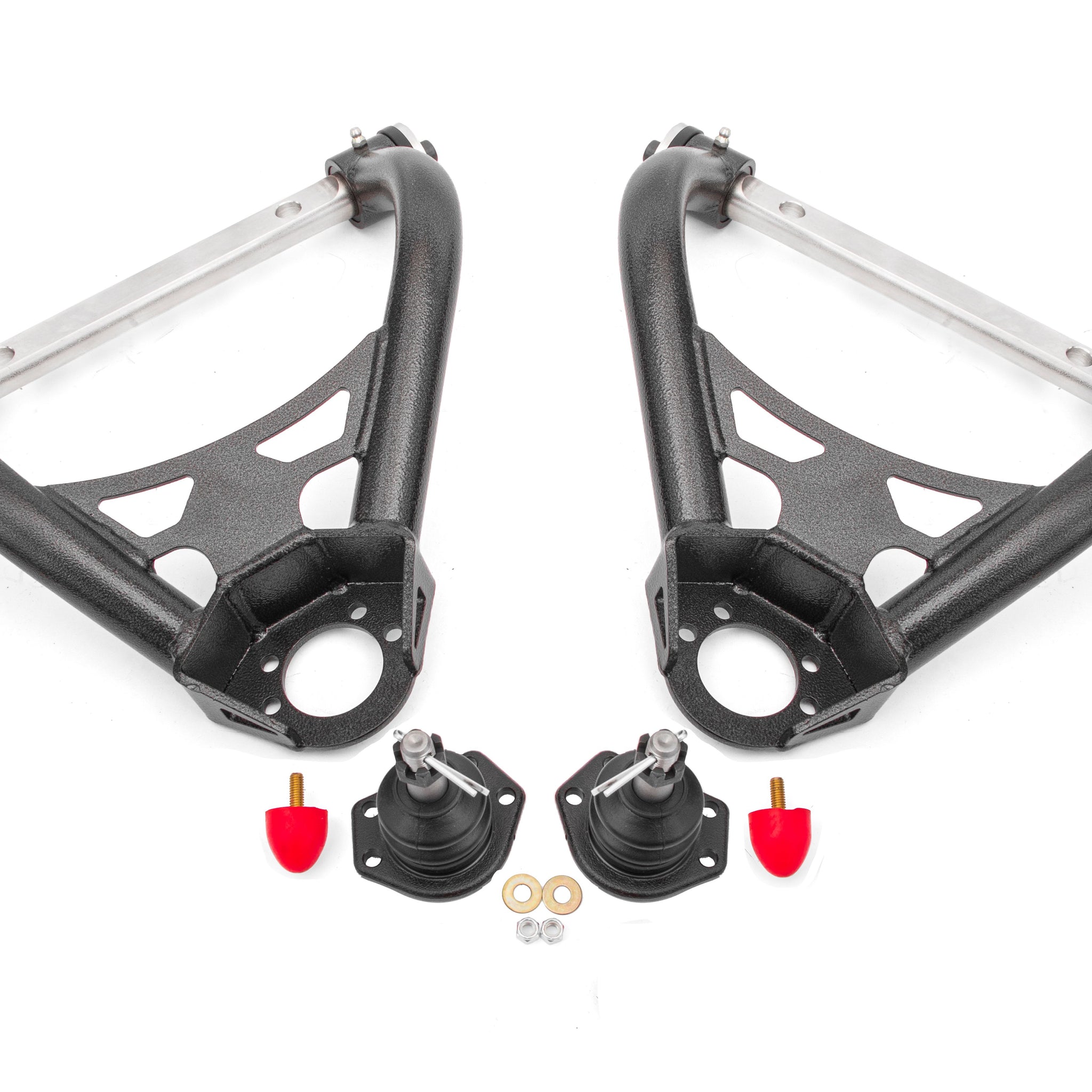 | Description_ASC | Fits 1964-1972 GM A-Body;Delrin bushings eliminate upper A-arm deflection;Improves steering feel and response for normal and performance driving;Increased high-speed stability;Laser-cut, CNC-formed plate steel braces for extra strength;Fixture welded for precise fit;Dual-offset cross-shafts for minimizing shim stack;Requires less shim stack for negative camber than OE arms;Internally fluted, Delrin bushings;Two additional degrees of positive caster built into A-arms;Additional header clearance;Pre-assembled with new polyurethane bumpstops;Includes new upper ball joints;Durable powdercoat finish;Proudly designed in the U.S.A.;Proudly made in the U.S.A. |