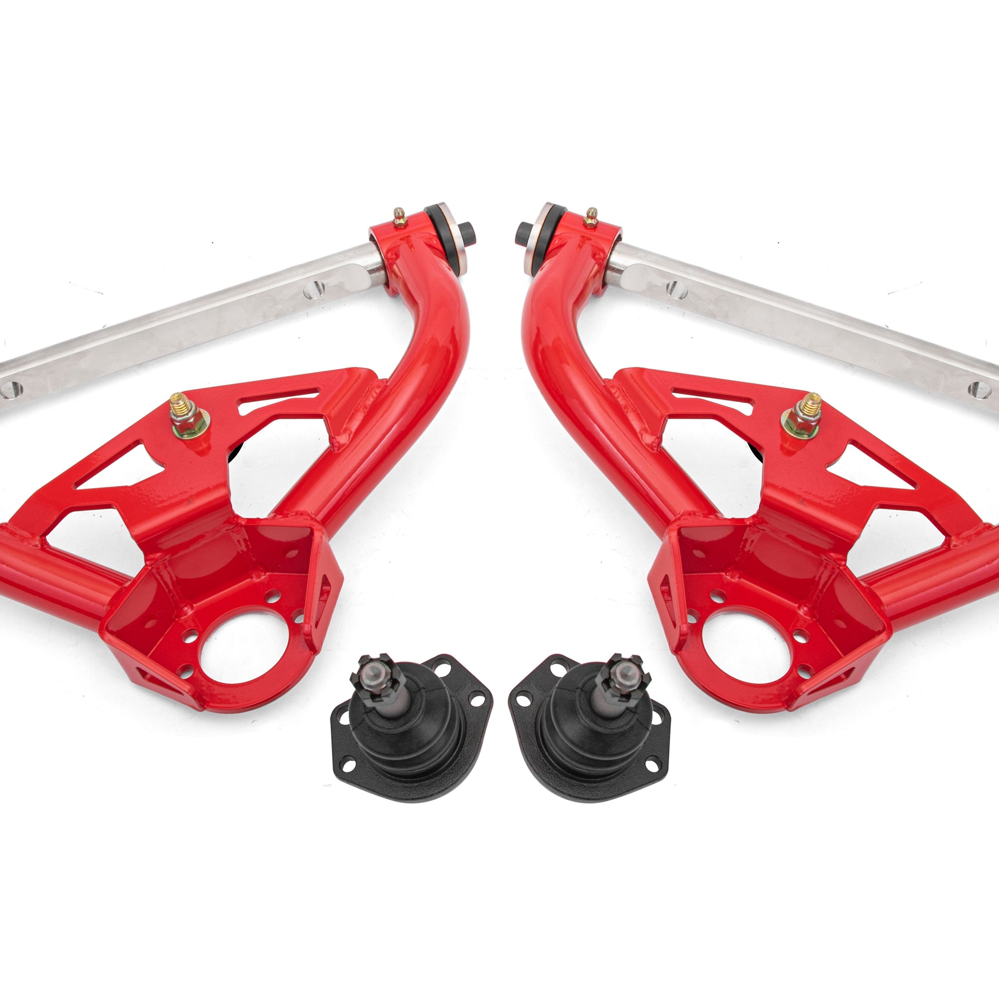 | Description_MKT | A-arms are one of the most important, yet overlooked suspension components. They are the direct link between the front wheels and the chassis. Any deflection causes a change in alignment, which results in poor performance and driving feel. Fabricated from heavy-duty 1.25-inch, 0.095-inch wall DOM tubing with laser-cut, CNC-formed plate steel braces for extra strength, deflection is eliminated with A-arms from BMR Suspension. BMR?s AAU461 Upper A-arms are equipped with CNC machined, nickel-plated, dual-offset cross-shafts with heavy-duty stainless bushing retainers. They come pre-assembled with new polyurethane bump stops, and new upper ball joints are included. Greasable, Delrin bushings add a solid, more responsive feel over the stock rubber bushings. BMR?s bushings are internally fluted, which allows grease to evenly coat the inner sleeve. These flutes also direct grease to the outer edge of the bushing, keeping the thrust surface lubricated. This efficient lubrication ensures quiet, reliable operation over the life of the bushings. |