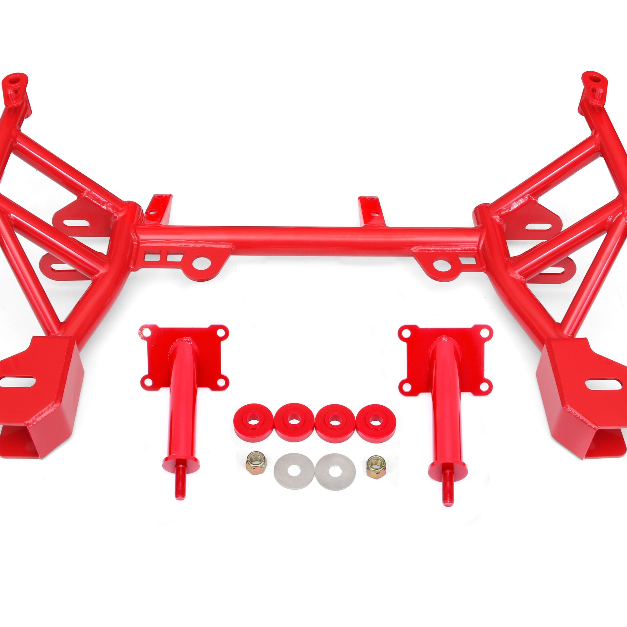 Reduce weight, increase frontend rigidity, and add clearance for large-tube headers and turbo kits with a Tubular K-members from BMR Suspension. BMR Tubular K-Members are designed to provide a lightweight alternative to the heavy and bulky factory K-member. Manufactured from 1-5/8-inch x 0.120 wall and 1-1/4-inch x 0.095 wall DOM tubing, BMR?s K-members give you a lightweight, extremely strong K-member. Every BMR K-member is 100-percent bolt-in and requires no modifications for fitment. The K-members are built with provision for either factory or manual steering racks.