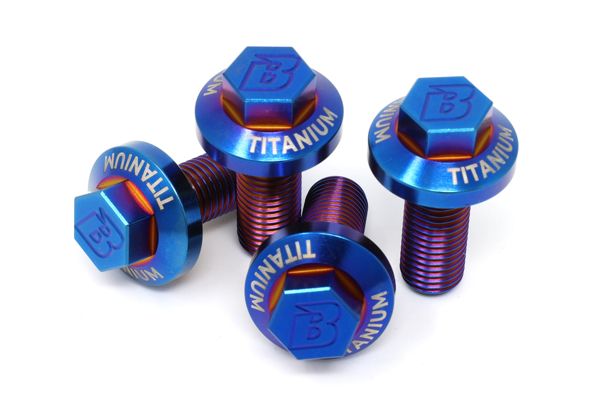 TITANIUM: CNC machined from a solid block of lightweight titanium with the Burger Motorsports "B" logo engraved on top. Each of our lightweight titanium bolts are individually burned by hand to make amazing color patterns. Therefore each one will have its own unique color. No two are the exact same and may slightly vary form the photos. We hand selected each 4 pack to all match as close as possible. Titanium is two times stronger than aluminum and 45% lighter than steel with comparable strength. Available in rainbow and blue hand burned titanium color.