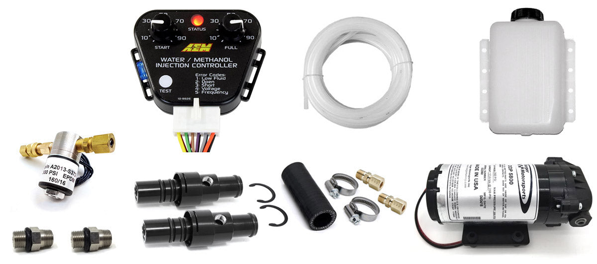The BMS water/methanol injection (WMI) kit includes a high quality Aquatec WMI pump made to our specifications, high speed solenoid with leak-free compression fittings, a WMI filter, and basic wiring and hardware.