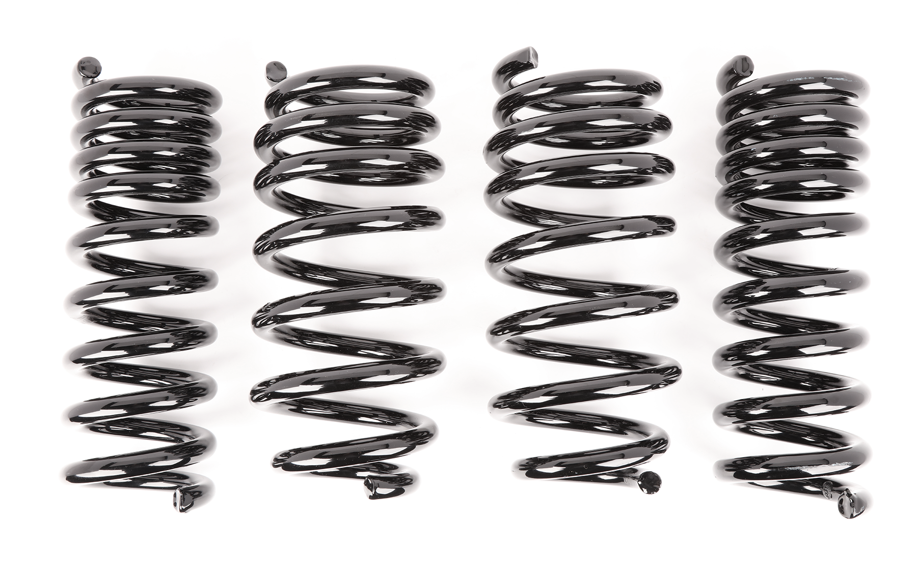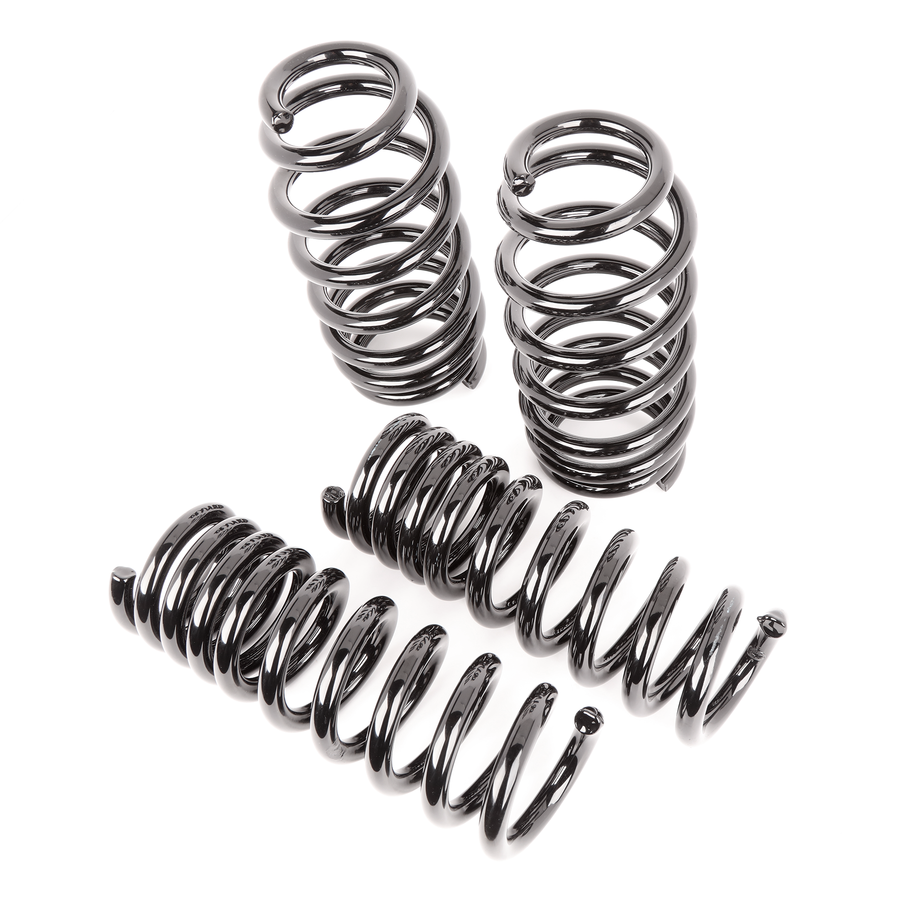 Lowering Springs, AXS Kit. Front and Rear. Dodge, Set of 4. Black powdercoat. Lowers front 1.25 in. and rear 1.3 in. Uses factory mounting locations for a direct fit. designed to be used with the OEM shocks. Made in USA . Fits 2009-2018 Dodge Challenger.