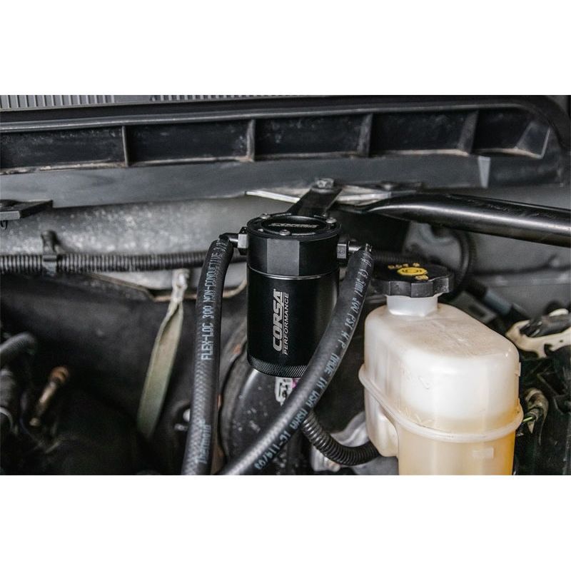 CORSA Performance's oil catch cans are the latest in a line of performance parts designed to maximize vehicle performance and longevity. Made from 6061 aluminum and featuring a multi-stage oil separation system, CORSA Performance oil catch cans work to eliminate blow-by of gas, water, oil vapors and particulates from the airpath. By reducing the impacts of blow-by, oil catch cans prevent damage to sensitive intake components and helps reduce carbon build-up on valves that over time reduce engine performance. Each vehicle specific oil catch can has been designed with OEM style quick disconnect fittings, premium automotive-grade hoses and upgraded components to ensure your vehicle runs at peak performance. Through careful design CORSA engineers have mounted each oil catch can in an easily accessible yet safe location allowing for ease of serviceability.