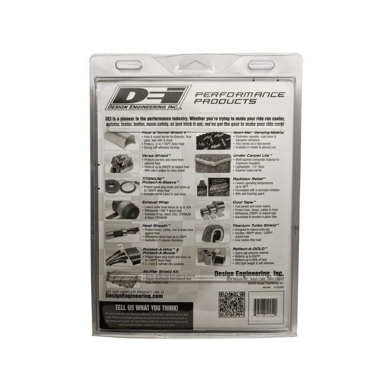 Pipe Shields solve the problem of needing spot heat protection for exhaust pipes and components. Extreme heat can rob power and potentially damage engines, transmissions, hoses, and sensitive electrical components. DEI, a market leader in thermal protection, has introduced a revolutionary advancement in pipe shield technology that greatly outperforms Mylar-backed glass fiber shields. DEI's Titanium Pipe Shield combines the high heat tolerance of DEIÂ's proprietary LR fiber technology with a unique rivet-based clamp shield design to improve heat dissipation and cooling. Glass fiber shields can begin to fail at 900°F with the Mylar outer material cracking and flaking off. DEI's Titanium Pipe Shield provides heat protection up to 1350°F. LR fiber technology is a two-ply material. The outer layer is made from pulverized and stranded lava rock into a proprietary tightly woven weave for durability and strength. The inside material is made of a special high temperature resistant fabric (89% silica) designed to withstand 350 degrees more heat than glass fiber. This proprietary fiber technology combined with DEI's unique shield standoff bracket design provides an air gap between the shield and pipe that together provides the maximum potential for cooling and heat dissipation. With the strategic placement of DEI's Titanium Pipe Shield near transmissions, brake lines, floorboards, body panels, diesel exhaust stacks or motorcycle pipes, radiant heat can be controlled for maximum protection and performance. Other uses include isolated areas such as sections of the exhaust pipe after the collector, an area that can heat transmission fluid, or along the path of an exhaust system in proximity of gas tanks, differentials and rear facias. The shield is designed for multiple automotive applications as well as marine, powersports, diesel and industrial applications where heat dissipation and thermal control is needed.