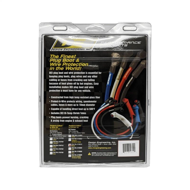 DEI Protect-A-Wire kits provide thermal protection for expensive spark plug wire sets. Protect your wires from potential burning, cracking, and hardening typically caused by severe under hood heat. DEI wire heat protection kits easily install by removing the distributor boot and sliding Protect-A-Wire(TM) over spark plug wire. Constructed from high temperature resistant glass fiber material Protects electrical wiring, speedometer cable, hoses & more 8mm ID Includes DEI Hi-Temp Boot Shrink Tubes 2 Cylinder Kit Contains: 7 feet of sleeving & 6 Hi-Temp Boot Shrink Tubes 4 Cylinder Kit Contains: 13 feet of sleeving & 12 Hi-Temp Boot Shrink Tubes 8 Cylinder Kit Contains: 25 feet of sleeving & 25 Hi-Temp Boot Shrink Tubes