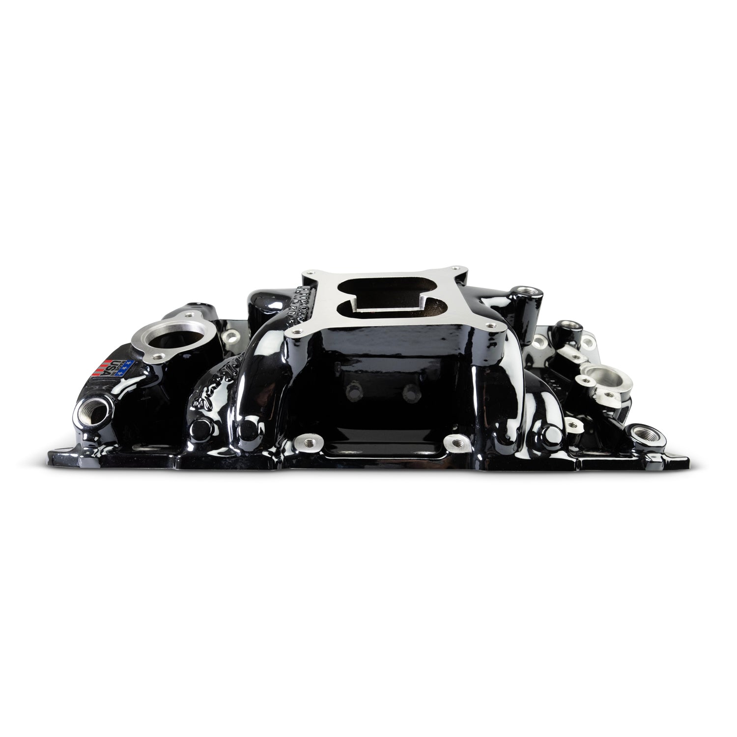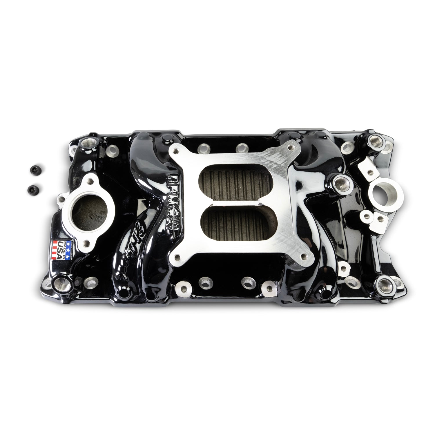 Edelbrock part #7501-BP RPM Air-Gap intake manifold is designed for 1955-86 262-400 c.i.d. Chevrolet V8 applications. The award-winning RPM Air-Gap intake manifold incorporates the same race-winning technology that's used on our Victor Series competition intakes. The air-gap design features an open air space that separates the runners from the hot engine oil resulting in a cooler, denser charge for more power. This PN 7501-BP version comes with a beautiful reflective Black Plasma finish that is durable and easy to maintain. The Plasma finishes are applied by a fully automated 7 stage prewash and 4 stage finish. A durable clear powder coat finishes the process.