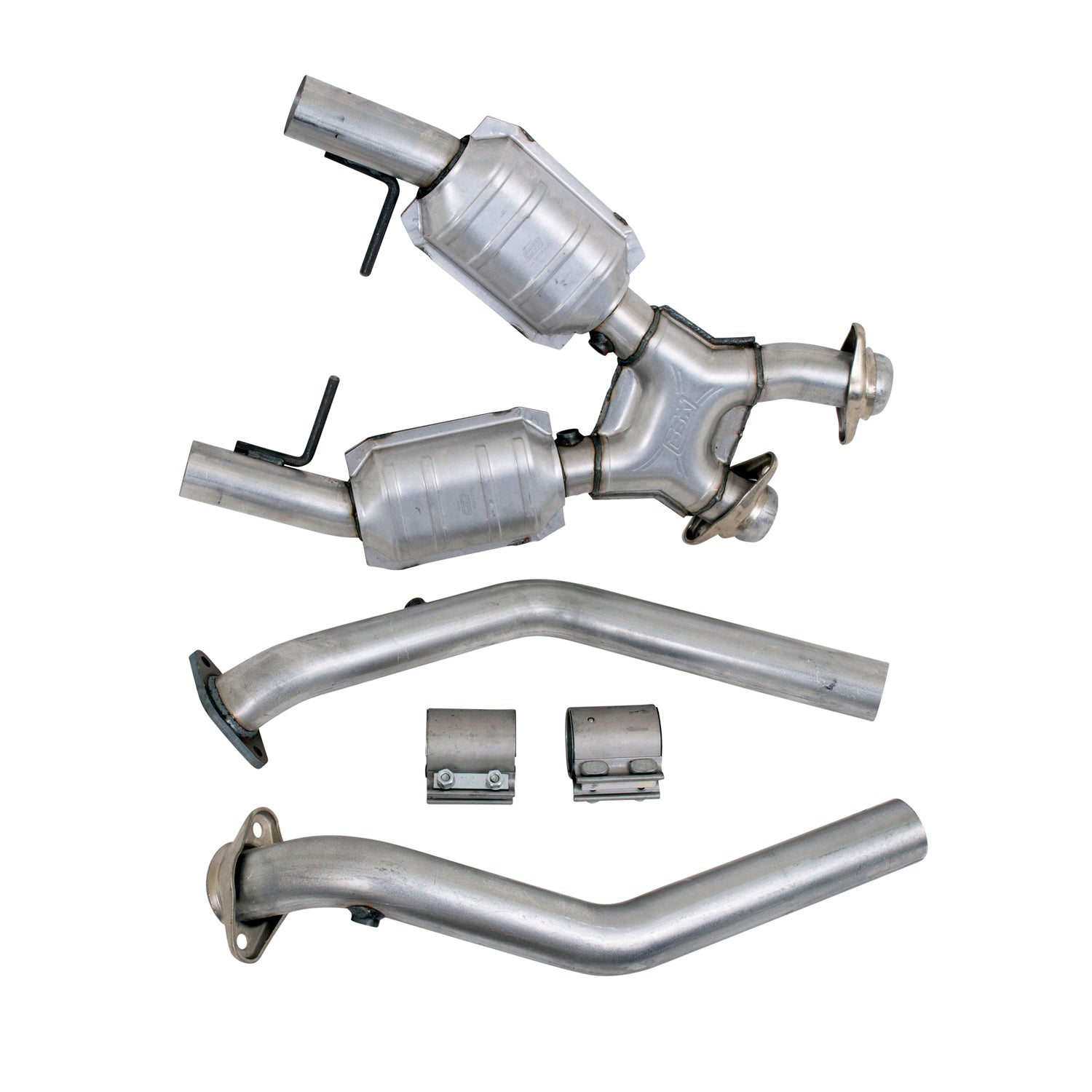 BBK High Flow performance X pipes are designed to maximize the horsepower and torque of your 1996-1998 Ford Mustang 4.6L GT. Every BBK Performance X pipe is designed as a direct replacement for the factory pipe and features larger diameter 16 gauge 2-1/2" CNC mandrel bent aluminized steel tubing with a unique BBK center X section for improved exhaust extraction, along with high flow catalytic converters to help increase exhaust flow and maximize performance to the rear wheels. These BBK full catted X pipes will install directly to the factory shorty exhaust headers or any aftermarket shorty exhaust and feature factory O2 sensor placement for simple direct installation. A BBK catted X pipe is the best way to really improve your Mustangs exhaust flow over the restrictive factory pipe to increase overall performance, plus it will sound great with an additional V8 muscle car growl. Please Note. This BBK product is not legal for use in some states including California: Please check your local emission laws and requirements.