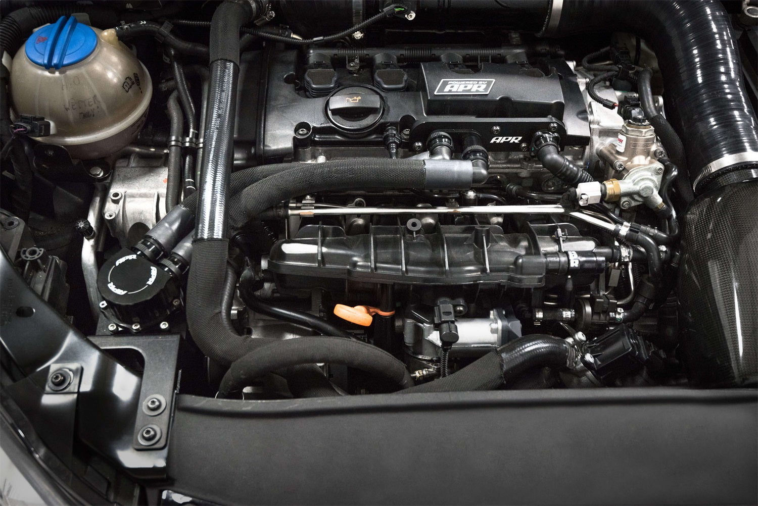 The APR Oil Catch Can System replaces the failure prone factory positive crank ventilation (PCV) system and traps excessive crankcase oil vapors and gunk from entering the engine. The system eliminates a common performance robbing boost leak, while reducing carbon buildup on intake valves, octane lowering oil vapors and oil pooling within the intake tract. It's a simple modification to install, drains in seconds with the flick of a knob, and is recommended at all stages of performance.