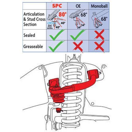 Get more droop travel: SPC's arm has improved clearance to get around the spring bucket when the arm droops, eliminating arm to frame contact on lifted trucks. The maintainable ball joint has an oversized ball and allows more than 80° of articulation to ensure it never binds. SpecRide bushings have free pivot to eliminate any chance of bushing failure seen on many high travel suspensions.