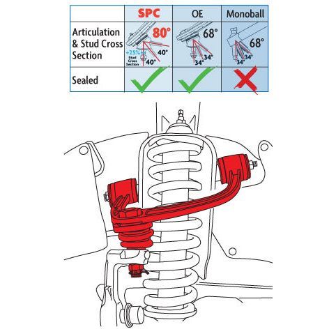 Get more droop travel: SPC's arm has improved clearance to get around the spring bucket when the arm droops, eliminating arm to frame contact on lifted trucks. The maintainable ball joint has an oversized ball and allows more than 80° of articulation to ensure it never binds. SpecRide bushings have free pivot to eliminate any chance of bushing failure seen on many high travel suspensions.