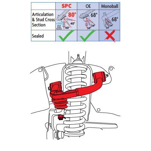 Get more droop travel: SPC's arm has improved clearance to get around the spring bucket when the arm droops, eliminating arm to frame contact on lifted trucks. The maintainable ball joint has an oversized ball and allows more than 80° of articulation to ensure it never binds. SpecRide bushings have free pivot to eliminate any chance of bushing failure seen on many high travel suspensions.