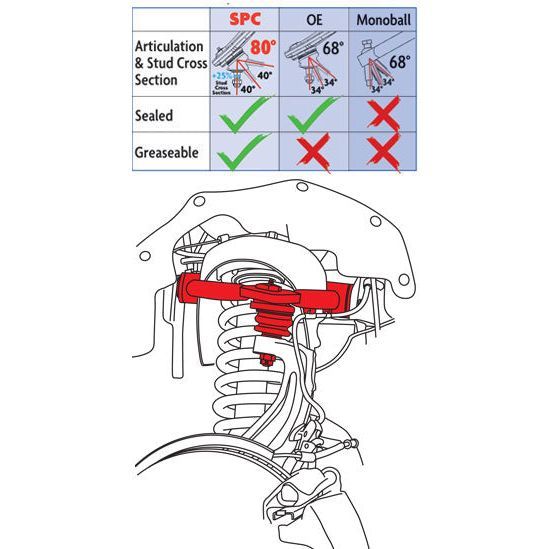 Get more droop travel: Don't let OE ball joint or mono-ball articulation limit your travel. SPC joints are oversized and provide 80° of travel.
