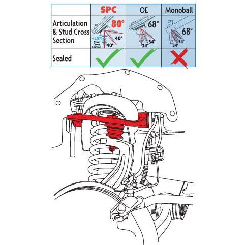Get more droop travel: SPC's arm has improved clearance to get around the spring bucket. With 80° of articulation in the upgraded ball joint and free pivoting cross axis bushings, SPC's arm gives you maximum droop travel.
