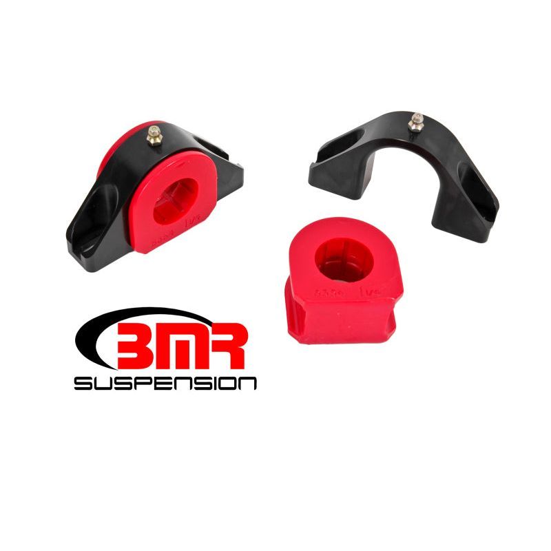 If you've installed one of BMR Suspension's 1 1/4-inch sway bars and want to improve its level of body roll control, upgrade the sway bar mounts and bushings with a Billet Aluminum/Polyurethane Sway Bar Mounting Kit from BMR Suspension. Most BMR sway bars come with formed steel sway bar mounts with polyurethane bushings. This gives you an effective sway bar mounting solution that works great for limiting the amount of wasted sway bar rate due to sway bar bushing deflection. Under extreme loads, slight bushing saddle deflection can absorbs sway bar rate and allow for slight amounts of body roll. BMR designed its Billet Aluminum/Polyurethane Sway Bar Mounting Kit to reduce saddle and bushing deflection. Reducing this deflection will reduce body roll and increase handling and launch consistency.
