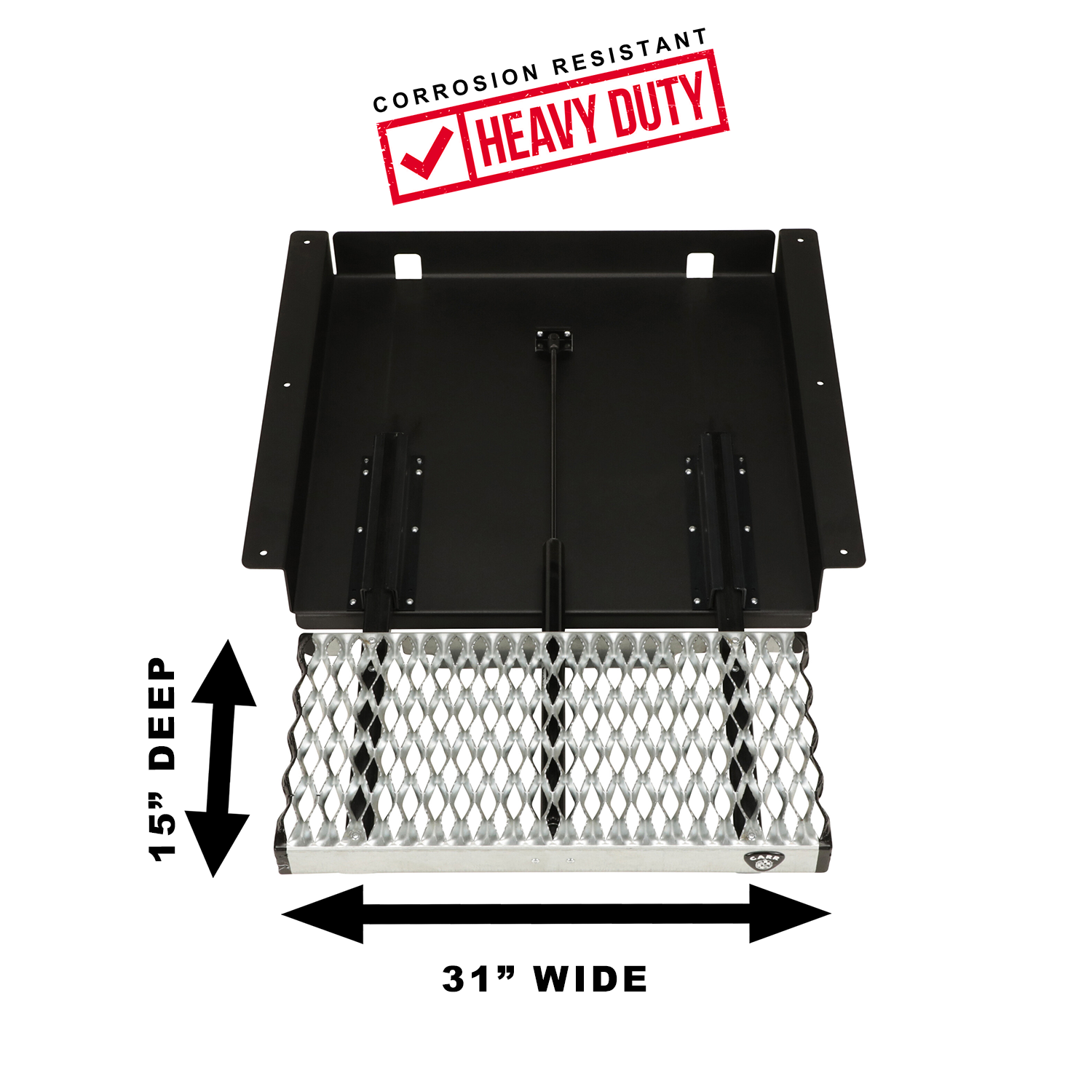 Hands free, fully assembled truck step. 500 lb. weight capacity. Easy to install and easy to use. Conveniently tucked away when not in use. Interior steel straps for additional strength. When in the out position both feet fit on the step. Large no-skid surface for increased safety. Comes with limited lifetime warranty on all materials and craftsmanship.