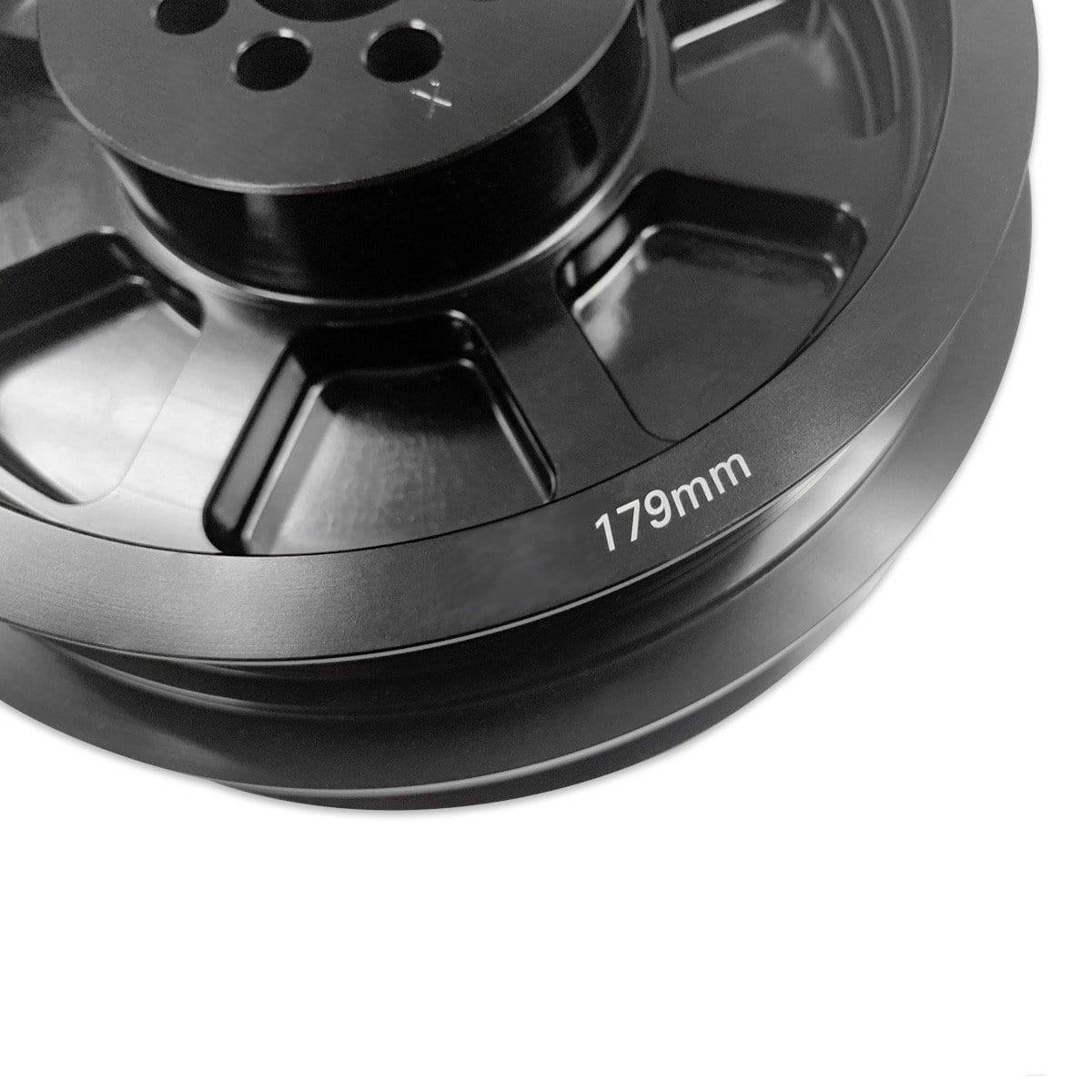 The 034Motorsport 3.0 TFSI Supercharger 179mm Crank Pulley Upgrade is machined from a single piece of 6061-T6 billet aluminum, and black anodized for an attractive finish resistant to corrosion. This design is 64% lighter than the OE pulley, significantly reducing rotational weight and parasitic loss. This is a single-piece inner and outer pulley, not a pulley "overlay", which adds rotational weight.