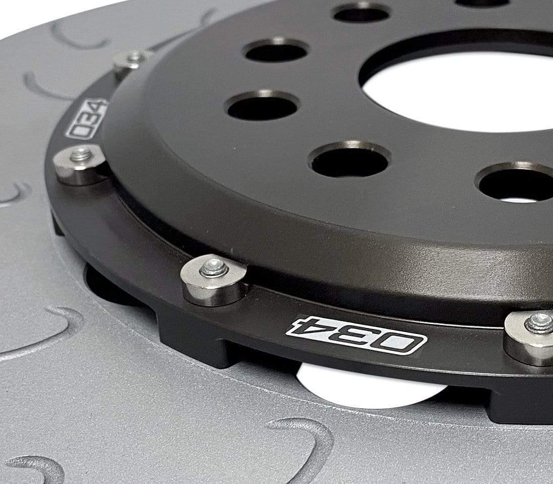 The 034Motorsport 340mmx30mm 2-Piece Floating Front Brake Rotor Upgrade Kit for the 8VW Mk7/7.5 GTI w/ Performance Pack, VW Mk7/7.5 Golf R, and Audi 8V/8V.5 S3 is a direct replacement for the OE brake discs, meaning no modifications are necessary. This front rotor pair will bolt directly to the car and work with factory brake calipers perfectly. By upgrading your brakes with lightweight, high-performance replacement discs compared to a big brake kit, the factory brake bias is maintained along with ABS efficiency.