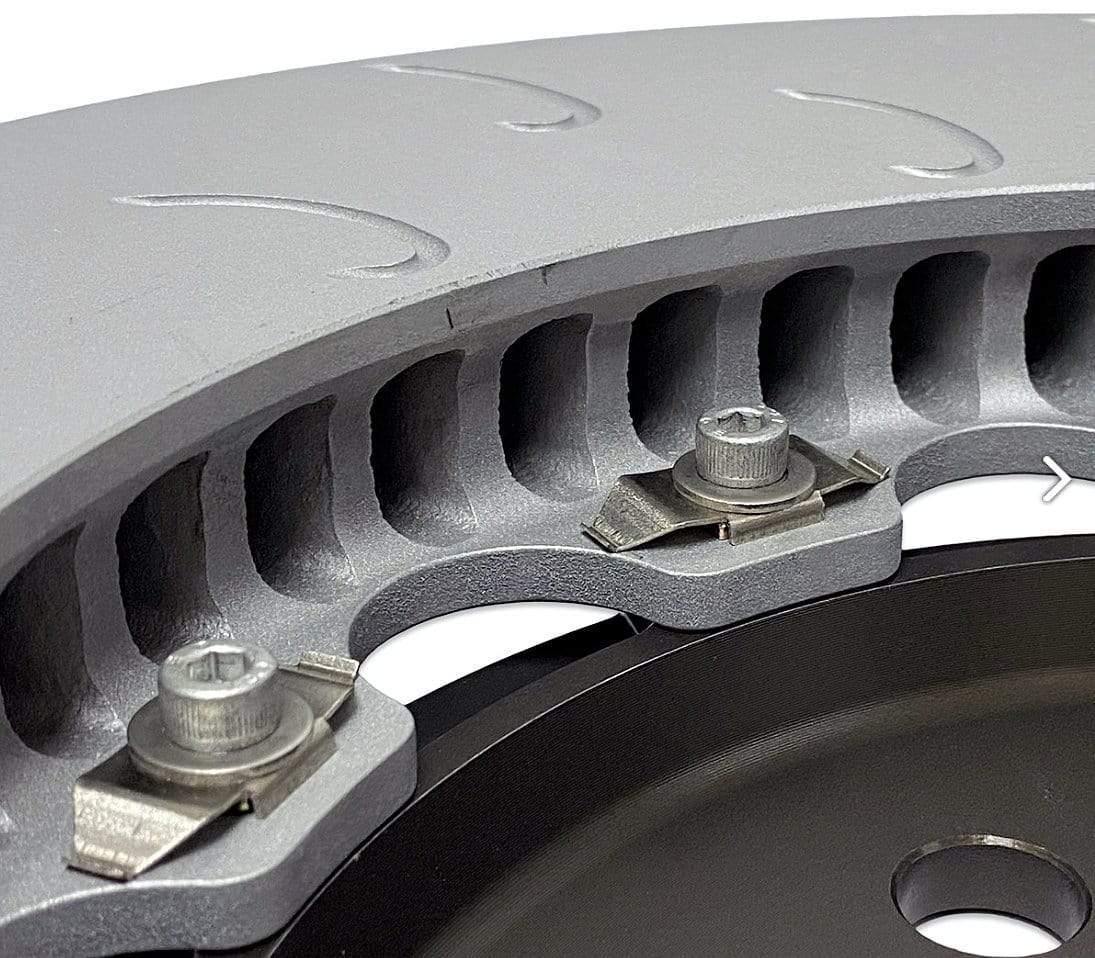 The 2-Piece Front Rotors weigh approximately 17.9lbs, significantly reducing the rotational weight per corner! This reduction in rotational and unsprung weight allows for quicker acceleration and suspension response.