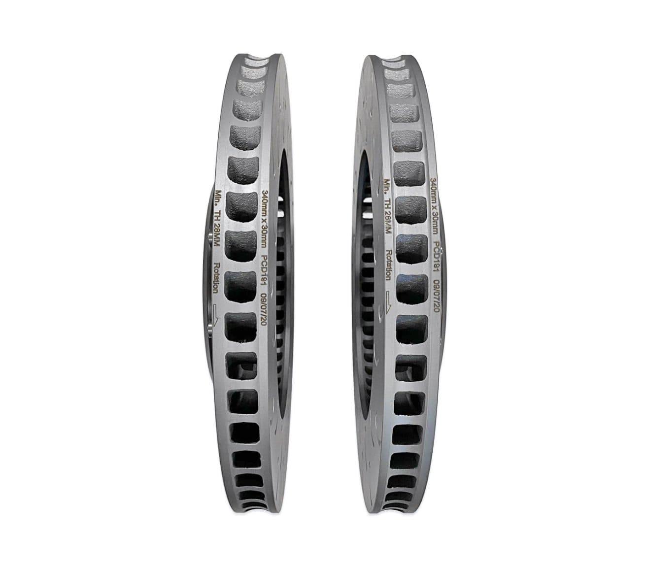 The central hat portion of the 034Motorsport rotor is made of 6061-T6 aircraft specification aluminum. The disc is constructed out of a proprietary metal alloy that can withstand immense braking temperatures while holding form. The rotor utilizes 72 directionally curved veins, developed in racing to act as a centrifugal pump to force cooling air through the disc.