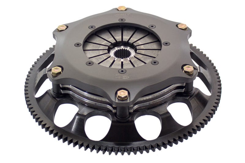 T1RR-N02 race, twin disc kits are race-ready for the serious enthusiast who needs a direct bolt-in kit, requiring no additional modifications. ACT's sintered iron race discs offer the highest torque capacity of all ACT race discs and have ultra-high heat capacity. Most kits offer pedal loads 10-20% higher than stock, yet increasing the clamp load by 80-90%. All ACT twin disc kits include a CNC-machined and dynamically balanced flywheel for trouble free use. All kits undergo an exclusive four-stage, heat-treating process on all diaphragms. ACT twin disc kits include a pressure plate, two discs, floater, flywheel and alignment tool. Some kits may include a pilot bearing and release bearing. ACT Twin disc kits meet SFI Specification 1.2.