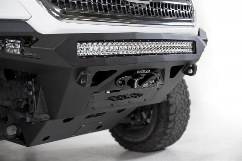 Addictive Desert Designs Stealth Fighter front bumper for the Toyota Tacoma is one of our best fitting and most aggressive looking bumpers on the market. A modern radius plate design allows the Stealth Fighter to keep a tight fit around the front of the Tacoma to match the factory design, while providing added protection. With our patented universal light mount system a 30 in. radius LED bar or up to 6 cube lights can be mounted into the center of the bumper. Additional lighting is available with two cube light mounts behind the side panels. Reinforced clevis mounts allow the use of a 3/4 in. D-Ring for added utility.