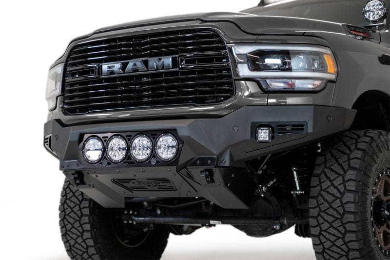 The Addictive Desert Designs Bomber Front Bumper is the slimmest fitting design for your 2020 Ram 2500. A modern plate steel design gives a clean look, while the full 3/16 in. aluminum skid plate saves on weight. Reinforced mounts for 3/4 in. D-Rings bolt straight to your frame for unrivaled strength. Three different lighting options are available: 4 Rigid 360 6 in. light mounts, 3 Baja Designs LP6 light mounts, or two 20 in. light bar mounts. Each bumper comes with two additional cube light mounts behind the side panels. As always, this bumper is fully bolt-on and made in America.