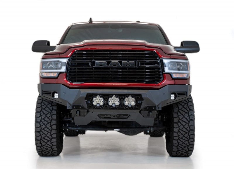 The Addictive Desert Designs Bomber Front Bumper is the slimmest fitting design for your 2020 Ram 2500. A modern plate steel design gives a clean look, while the full 3/16 in. aluminum skid plate saves on weight. Reinforced mounts for 3/4 in. D-Rings bolt straight to your frame for unrivaled strength. Three different lighting options are available: 4 Rigid 360 6 in. light mounts, 3 Baja Designs LP6 light mounts, or two 20 in. light bar mounts. Each bumper comes with two additional cube light mounts behind the side panels. As always, this bumper is fully bolt-on and made in America.
