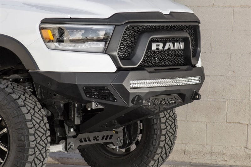 The RAM Rebel has never looked better with the Stealth Fighter front bumper. A radius steel plate design gives your RAM truck added front end protection without all the extra bulk. Matching the RAM Rebel factory body lines, the Stealth Fighter front bumper is a tight fitting steel plate bumper that compliments the RAMs look. A patented universal light mount system allows mounting up to a 40 in. radius LED or 10 cube lights. Mount any combination of brand, size, and style light to give your RAM front bumper the added lighting that you need. Fully bolt-on means there is no cutting or welding required to install the Stealth Fighter front bumper. Reinforced D-Ring mounts provide your truck with added utility to pull through any tough situation, while optional parking sensor cutouts retain your trucks OEM amenities.