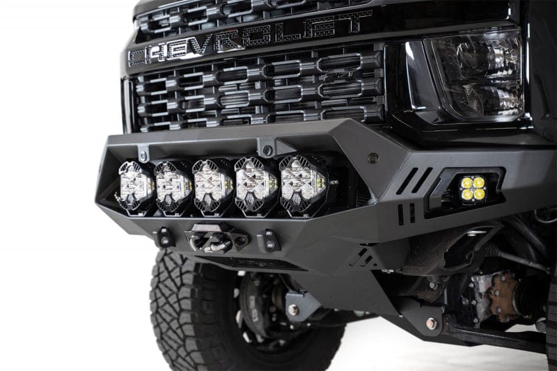 Heavy duty trucks call for heavy duty bumpers. The Chevy Silverado 2500 Bomber HD front bumper features a rugged plate steel design. A separate plate mounts your Winch directly to the frame for unrivaled strength. Our reinforced clevis mounts provide a mounting point for 3/4 in. D-Rings for more added utility. Multiple lighting options are available, including six Rigid 360 series lights, five Baja Designs LP6 lights, or dual 40 in. radius light bars. One cube light can also be mounted behind each side panel. OEM parking sensors are retained. As always, this product is fully bolt-on and made in America.