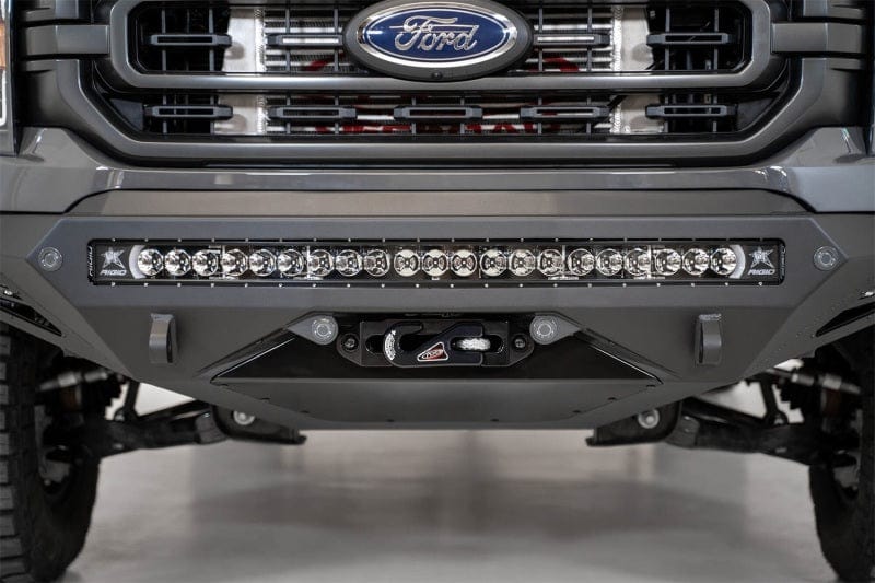 The Stealth Fighter is a plate steel bumper with a radiused front edge that keeps it tight to the truck. There is a universal light mount system in the center of the bumper that holds up to a 40 in. radius light bar or 10 cube lights. Each side panel has a mount capable of holding either a 10 in. single row light bar or a cube light. Reinforced clevis mounts provide a mounting point for 3/4 in. D-Rings, while the optional Winch mount provides even more utility. Sensor cutouts make this bumper compatible with both sensor and non-sensor trucks. As always, this bumper is fully bolt-on and made in America.