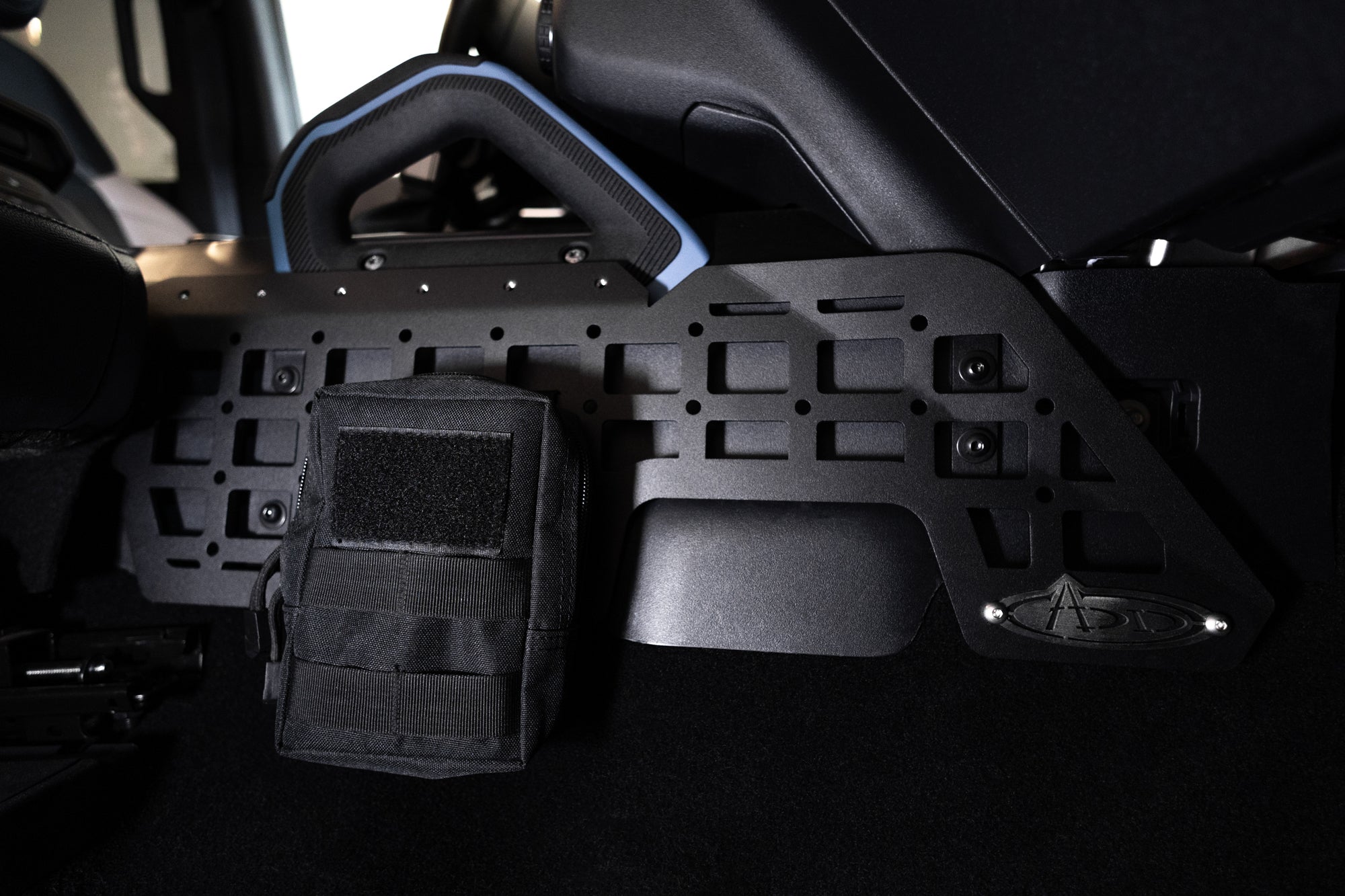 | Description_MKT | The ADD Center Console Molle Panels are constructed from 1/8th inch steel and finished in hammer black powder coat. The kit comes with driver and passenger side panels, each with a row of 8 PEM nuts along the top for easy installation of device holders. The molle design on each panel allows you to strap, bolt or clip accessories like radios, holsters, or other gear to them. The dual panel design ensures that all factory controls remain fully accessible. These panels are made in America. |