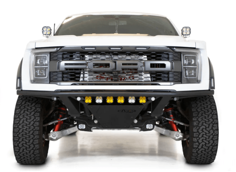Our ADD Pro Frame Cut Raptor Front Bumper maximizes your approach angle, and does it with a clean and refined style. It closely follows the body contours of the front end of your Raptor. Utilizing .120 in. wall steel tubing thats finished in a hammer black powder coat its low-profile fitment enables you to hit those desert whoops with virtually no worries about your ground clearance. A satin black aluminum skid plate helps protect the undercarriage when approaching steep hills or dunes. At the center of the bumper a 20-inch radius LED light bar can be mounted for the sake of nighttime adventures. Alternatively up to 6 cube lights can be mounted in place of the light bar. The light mount sits protected underneath the tube steel and above the skid plate. As always this bumper is made in America.