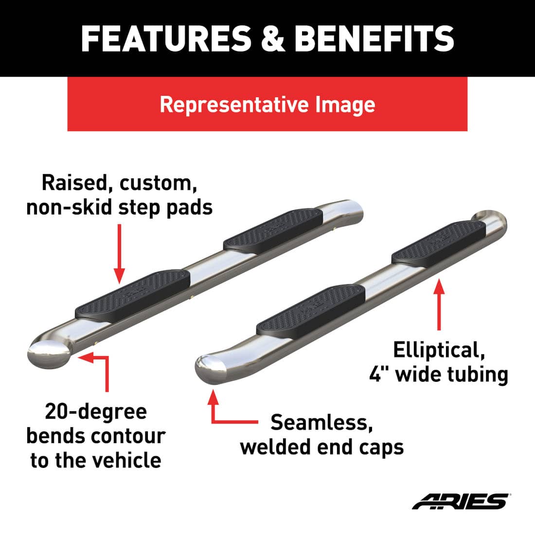 ARIES STAINLESS 4" OVAL CAB LENGTH NERF BARS ; 09-18 DODGE RAM 1500/ 19-24 1500 CLASSIC QUAD CAB