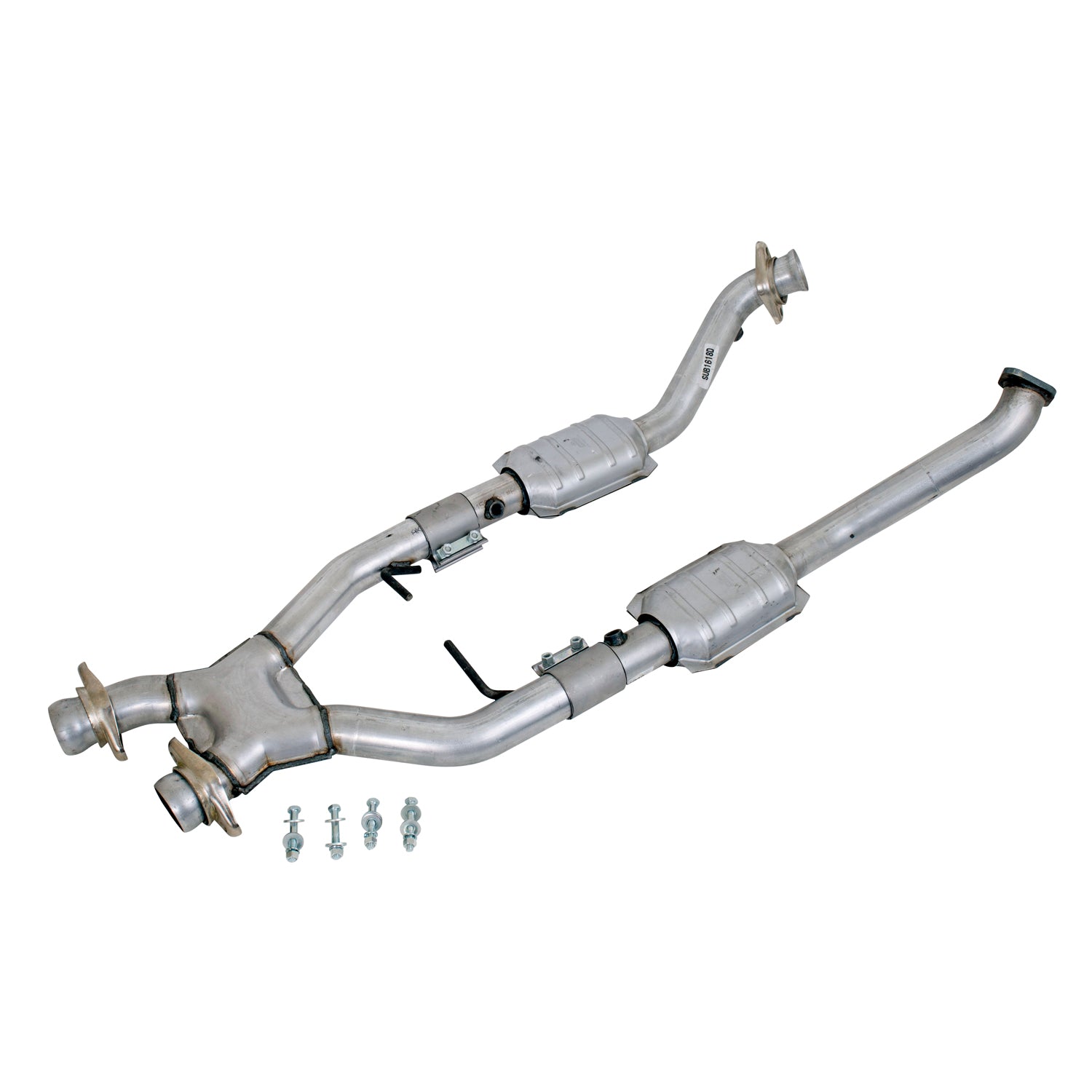 BBK High Flow performance X pipes are designed to maximize the horsepower and torque of your 1996-1998 Ford Mustang Cobra 4.6L 4V. Every BBK Performancec X pipe is designed as a direct replacement for the factory pipe and features larger diameter 16 gauge 2-1/2" CNC mandrel bent amuminized steel tubing with a unique BBK center X section for improved exhaust extraction, along with high flow catalytic converters to help increase exhaust flow and maximize performance to the rear wheels. These BBK full catted X pipes will install directly to the factory exhaust headers or any aftermarket shorty exhaust and feature factory O2 sensor placement for simple direct installation. A BBK catted X pipe is the best way to really improve your Mustangs exhaust flow over the restrictive factory pipe to increase overall performance, plus it will sound great with an additional V8 muscle car growl. Please Note. This BBK product is not legal for use in some states including California: Please check your local emission laws and requirements.