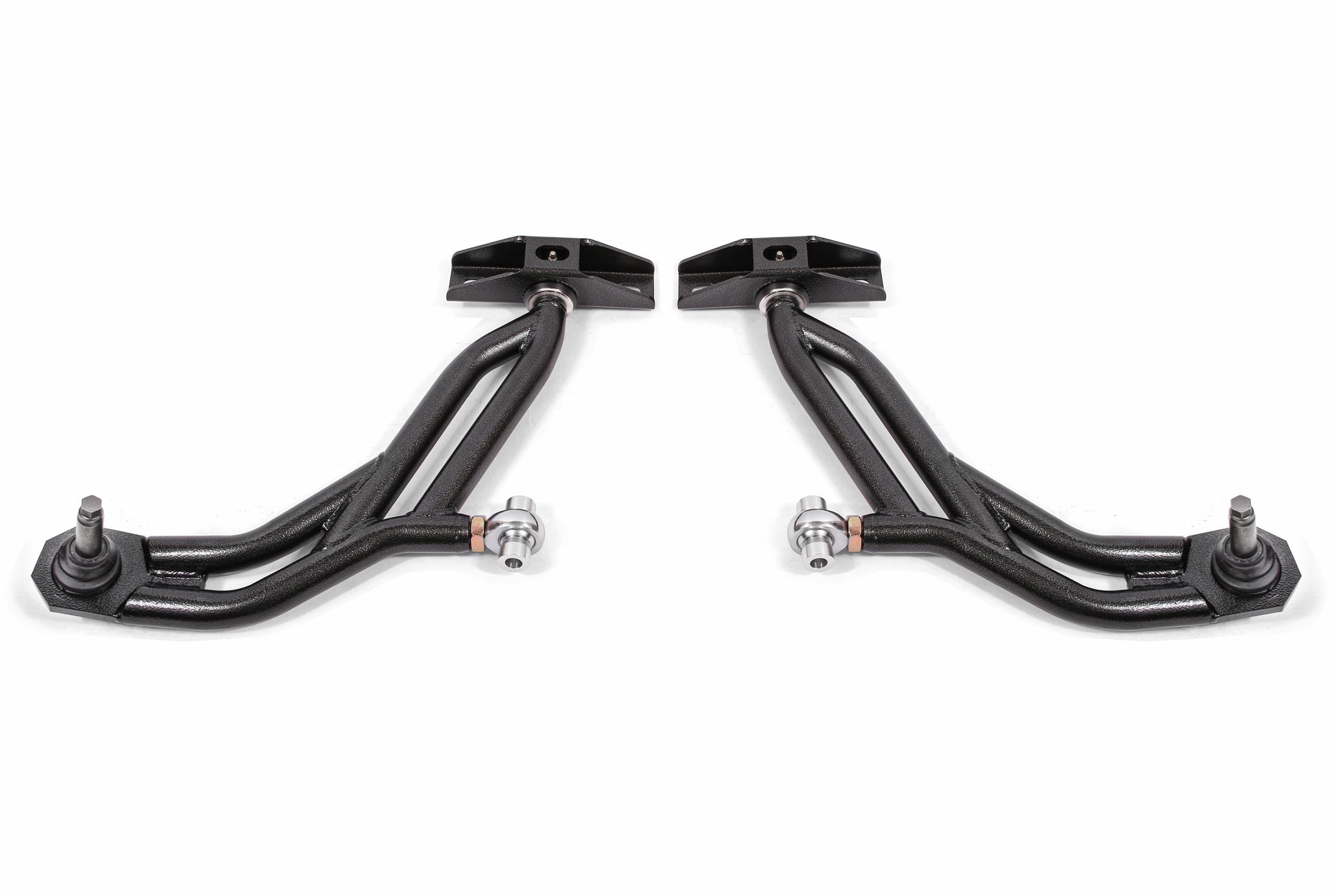 A-arms are one of the most important, yet overlooked suspension components. They are the direct link between the front wheels and the chassis. Any deflection causes a change in alignment, which results in poor performance and driving feel. Fabricated from heavy-duty 1.25-inch, 0.120-inch wall DOM tubing, deflection is eliminated with A-arms from BMR Suspension. BMR?s AA757 Lower A-arms are equipped with greasable heavy-duty ball joints, greasable Delrin bushings (rear mount) to handle the high loads, and zinc-plated, X-series, heat-treated, chrome-moly, self-lubricating, Teflon-lined rod ends for loads of adjustability. Solid mounts give you a more responsive feel over the stock rubber bushings. BMR?s bushings allow grease to evenly coat the inner sleeve. This efficient lubrication ensures quiet, reliable operation over the life of the bushings. The combination of rod ends and Delrin bushings gives you improved steering feel and responsiveness for any for of driving. Based on our well proven traditional A-arm design, these Handling A-arms feature ?-inch taller ball joints to raise the roll center height on lowered vehicles for improved handling.
