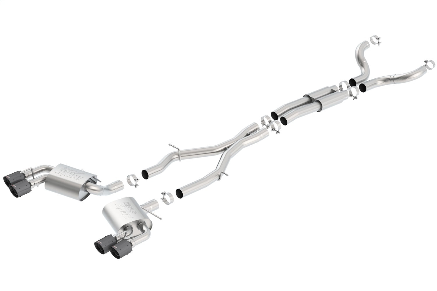 This 3" diameter with 2.25" diameter tail pipes BORLA Cat-Back system is intended for vehicles with significant performance upgrades. It contains a merge X-Pipe for increased performance and improved sound. The system delivers the aggressive ATAK sound with no drone inside the vehicle. Each muffler assembly has unique dual 4" round carbon fiber with black center tips. A system with polished T-304 stainless steel tips is also available. The system will fit vehicles with Dual Mode Exhaust (NPP), but it does NOT include Dual Mode or AFM valves. On vehicles with AFM a check engine light will be activated. It may be used with the dual tip lower bumper cover to convert a single, split rear exit to a dual split rear exit. BORLA Cat-Back & Axle-Back exhaust systems feature patented straight-through and multi-core technology to unleash hidden horsepower. Increased exhaust velocity adds power, driving excitement, fuel economy, and the distinctive BORLA Sound of Power respected by motoring enthusiasts everywhere. Each system is built from premium T-304 austenitic stainless steel, superior to T-400 series knockoffs (such as 409), to give you the absolute best in performance and durability. Ultra-smooth mandrel bends ensure maximum flow & power, and precision computer numerical control (CNC) manufacturing ensures an accurate fit. Best of all, BORLA stands behind every system with a Million-Mile Warranty. Just what you'd expect from the world's most experienced (and most winning) exhaust brand.