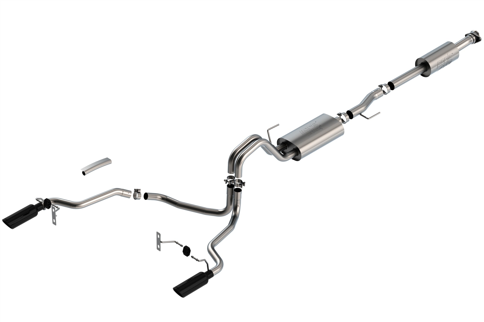 The 3" diameter into dual 2.25" BORLA Cat-Back system was specifically designed to enhance the power and sound of the Ford F-150 equipped with 3.3L engine. The split rear exit configuration replaces the single factory tail pipe, and has single 4" round black chrome on T-304 stainless steel tips on each tail pipe. Using BORLA Stainless Steel Polish p# 21461 is NOT recommended with these black chrome tips. We suggest cleaning the tips with hot water and a microfiber cloth. A system with bright chrome on T-304 stainless steel tips is also available. This system features the aggressive ATAK sound with no drone. Additional systems are available with different options for sound level, tip finish and tip exits. Add adapter 60556 for Crew Cab with Standard Bed (6' 7") 157.2" Wheelbase vehicles. Add adapter 60564 for Extended Cab with Long Bed (8' 2") 164.1" Wheelbase vehicles. BORLA Cat-Back & Axle-Back exhaust systems feature patented straight-through and multi-core technology to unleash hidden horsepower. Increased exhaust velocity adds power, driving excitement, fuel economy, and the distinctive BORLA Sound of Power respected by motoring enthusiasts everywhere. Each system is built from premium, high-quality T-304 stainless steel, to give you the absolute best in performance and durability. Ultra-smooth mandrel bends ensure maximum flow & power, and computer numerical control (CNC) manufacturing ensures an accurate fit. All this is backed by our unsurpassed Million Mile Warranty. System Features: Cat-Back System Split Rear Exit 4" Round Black Chrome On T-304 Stainless Steel Tips ATAK Sound Level T-304 Stainless Steel Construction Bolt-On Installation Million Mile Warranty