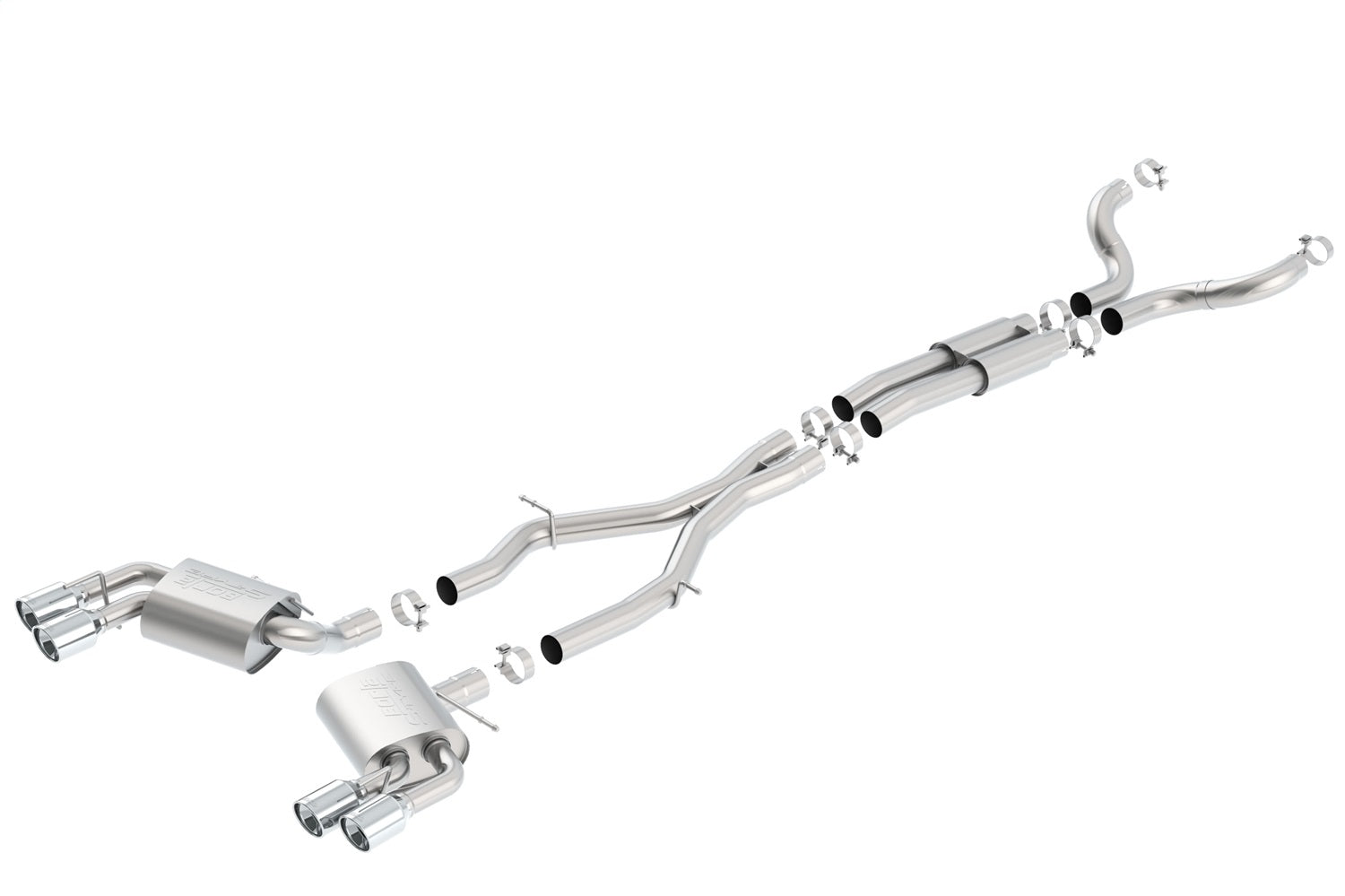This 3" diameter with 2.25" diameter tail pipes BORLA Cat-Back system is intended for vehicles with significant performance upgrades. It contains a merge X-Pipe for increased performance and improved sound. The system delivers the classic S-Type sound with no drone inside the vehicle. Each muffler assembly has dual 4" round polished T-304 stainless steel tips. A system with carbon fiber tips is also available. The system will fit vehicles with Dual Mode Exhaust (NPP), but it does NOT include Dual Mode or AFM valves. On vehicles with AFM a check engine light will be activated. It may be used with the dual tip lower bumper cover to convert a single, split rear exit to a dual split rear exit. BORLA Cat-Back & Axle-Back exhaust systems feature patented straight-through and multi-core technology to unleash hidden horsepower. Increased exhaust velocity adds power, driving excitement, fuel economy, and the distinctive BORLA Sound of Power respected by motoring enthusiasts everywhere. Each system is built from premium T-304 austenitic stainless steel, superior to T-400 series knockoffs (such as 409), to give you the absolute best in performance and durability. Ultra-smooth mandrel bends ensure maximum flow & power, and precision computer numerical control (CNC) manufacturing ensures an accurate fit. Best of all, BORLA stands behind every system with a Million-Mile Warranty. Just what you'd expect from the world's most experienced (and most winning) exhaust brand.