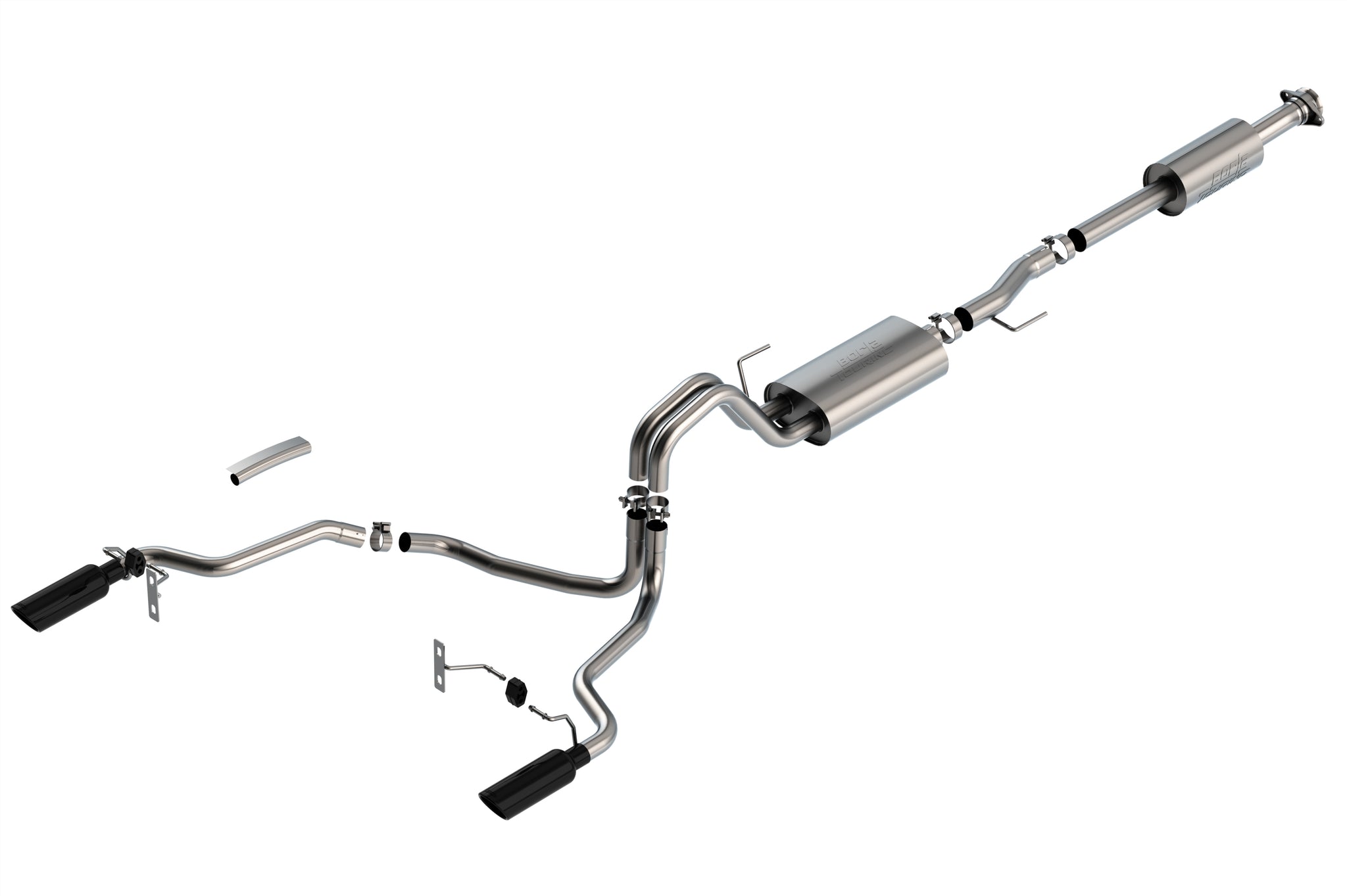 This 3" into dual 2.25" diameter BORLA Cat-Back system was specifically designed to enhance the power and sound of the Ford F-150 equipped with 2.7L and 3.5L engines. The split rear exit configuration replaces the single factory tail pipe, and has single 4" round black chrome on T-304 stainless steel tips on each tail pipe. Using BORLA Stainless Steel Polish p# 21461 is NOT recommended with these black chrome tips. We suggest cleaning the tips with hot water and a microfiber cloth. A system with bright chrome on T-304 stainless steel tips is also available. This system features the mellow Touring sound that gives you a mild sound of power with no drone. Additional system are available with different options for sound level, tip finish and tip exits. Add Adapter 60556 for Crew Cab with Standard Bed (6' 7") 157.2" Wheelbase vehicles. Add Adapter 60564 for Extended Cab with Long Bed (8' 2") 164.1" Wheelbase vehicles. BORLA Cat-Back & Axle-Back exhaust systems feature patented straight-through and multi-core technology to unleash hidden horsepower. Increased exhaust velocity adds power, driving excitement, fuel economy, and the distinctive BORLA Sound of Power respected by motoring enthusiasts everywhere. Each system is built from premium, high-quality T-304 austenitic stainless steel, superior to T-400 series knockoffs (such as 409), to give you the absolute best in performance and durability. Ultra-smooth mandrel bends ensure maximum flow & power, and precision computer numerical control (CNC) manufacturing ensures an accurate fit. All this is backed by our unsurpassed Million Mile Warranty. System Features: Cat-Back System Split Rear Exit 4" Round Black Chrome On T-304 Stainless Steel Tips Touring Sound Level T-304 Stainless Steel Construction Bolt-On Installation Million Mile Warranty