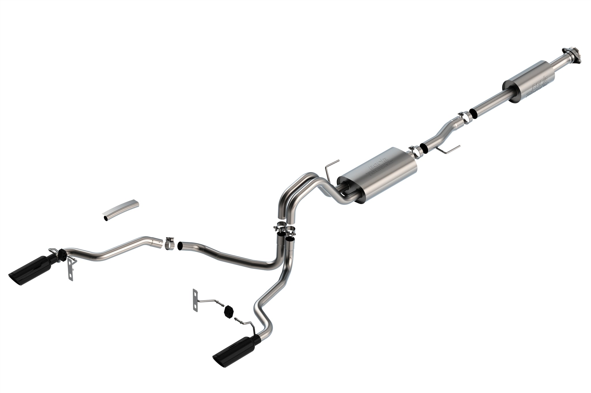 The 3" into dual 2.25" diameter BORLA Cat-Back system was specifically designed to enhance the power and sound of the Ford F-150 equipped with the 5.0L V8 engine. The split rear exit configuration replaces the single factory tail pipe, and has single 4" round black chrome on T-304 stainless steel tips on each tail pipe. Using BORLA Stainless Steel Polish p# 21461 is NOT recommended with these black chrome tips. We suggest cleaning the tips with hot water and a microfiber cloth. A system with bright chrome on T-304 stainless steel is also available. This system features the mellow Touring sound that gives you a mild sound of power with no drone. Additional systems are available with different options for sound level, tip finish and tip exits. Add adapter 60556 for Crew Cab with Standard Bed (6' 7') 157.2" Wheelbase vehicles. Add adapter 60564 for Extended Cab with Long Bed (8' 2") 164.1" Wheelbase vehicles. BORLA Cat-Back & Axle-Back exhaust systems feature patented straight-through and multi-core technology to unleash hidden horsepower. Increased exhaust velocity adds power, driving excitement, fuel economy, and the distinctive BORLA Sound of Power respected by motoring enthusiasts everywhere. Each system is built from premium, high-quality T-304 austenitic stainless steel, superior to T-400 series knockoffs (such as 409), to give you the absolute best in performance and durability. Ultra-smooth mandrel bends ensure maximum flow & power, and precision computer numerical control (CNC) manufacturing ensures an accurate fit. All this is backed by our unsurpassed Million Mile Warranty. System Features: Cat-Back System Split Rear Exit 4" Round Black Chrome On T-304 Stainless Steel Tips Touring Sound Level T-304 Stainless Steel Construction Bolt-On Installation Million Mile Warranty