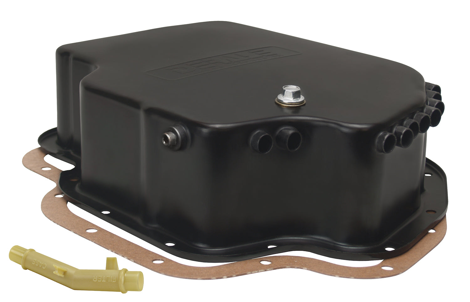 Derale's TH400 Deep Transmission Cooling Pan #14202 uses air passing beneath the vehicle and redirects it to help lower transmission oil temperatures. With brazed, turbulator-equipped airway tubes passing through the lower section of the transmission pan for more efficient cooling, each is individually pressure tested to ensure a leak-free pan. We've included a much stronger magnetic drain plug and rubber/steel reusable washer, in addition to a 1/8" NPT temperature sender bung located in the side of the pan. Finished with a durable black two-stage coating, each pan also includes neoprene gasket and 1/8" NPT temperature sender plug.