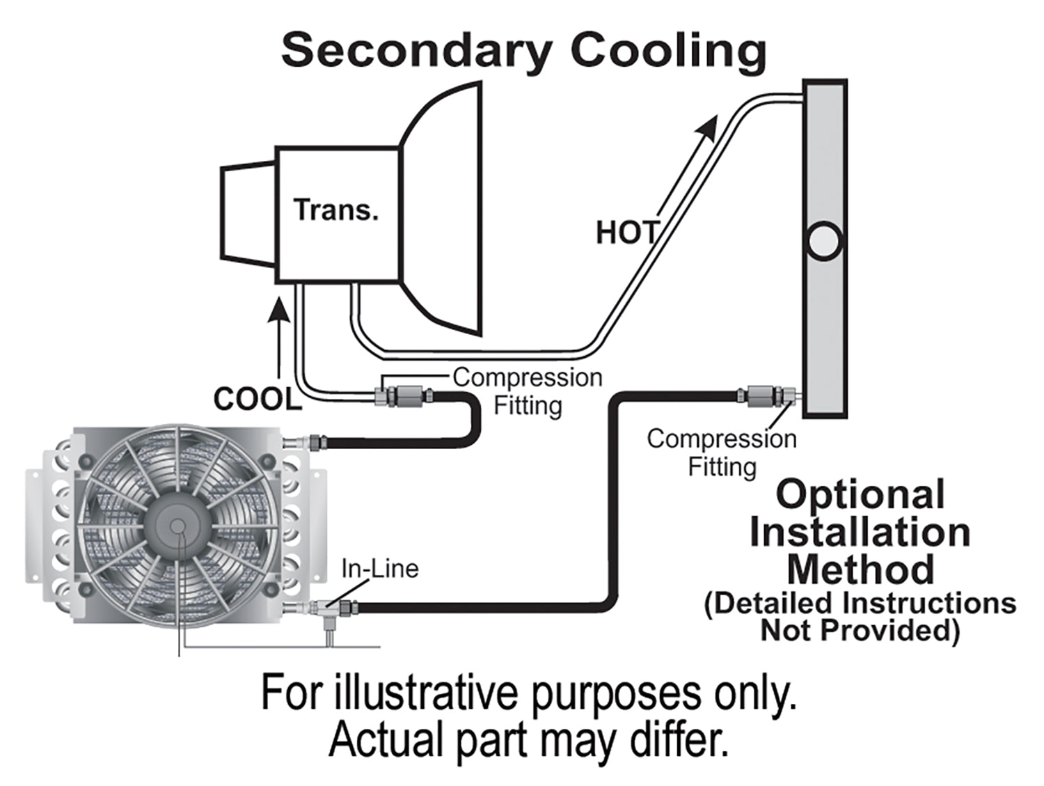 | Description_ASC | Transmission cooler kit includes fan mounted cooler, two aluminum -8AN fittings and four -8AN x 1/2" hose barb fittings, 180°F In-line thermostat, 10 ft. of OEM spec hose, two 1/2" compression fittings, and mounting hardware |
