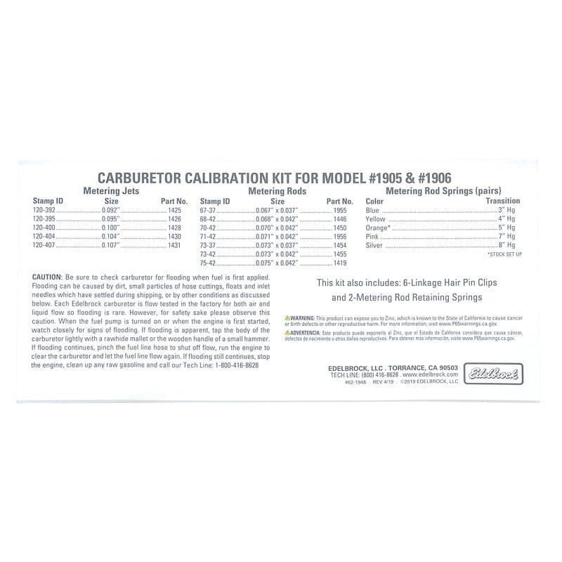 The AVS2 Series Carburetor Calibration Kit #1948 is for tuners looking to custom-tune the performance of their #1905 or #1906 carburetor. This kit contains all of the necessary metering rods and jets that will allow you to adjust your AVS2 carburetor either richer or leaner for both cruising and power modes. This kit also includes an assortment of five pairs of jets, seven pairs of metering rods, five step-up springs, metering rod retaining springs, six replacement hairpin springs and a calibration chart that tells which rod/jet combination to use, all organized in a handy reusable storage case.