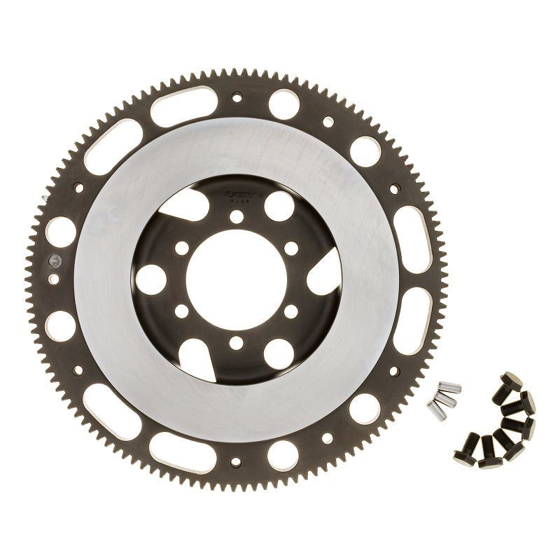 Exedy flywheels combine low weight, low inertia and high thermal capacity. They are designed for lightly tuned racing cars and drag racing, autocross and rally events, as well as street usage. They are made from solid one-piece billet chromoly steel or chromoly steel forgings. They are specifically designed to reduce weight and inertia for better engine response. Most incorporate special design features to enhance airflow and cooling of the clutch. The ring gear teeth are integrated onto the flywheel unlike an aluminum flywheel where the ring gear is pressed onto the flywheel and has the possibility of separating due to different expansion coefficients of aluminum vs. steel. Exedy steel billet and forged steel flywheels have passed engineering tests to 15,000-18,000 rpm and guaranteed not to fail to the said rpm and are all SFI approved.